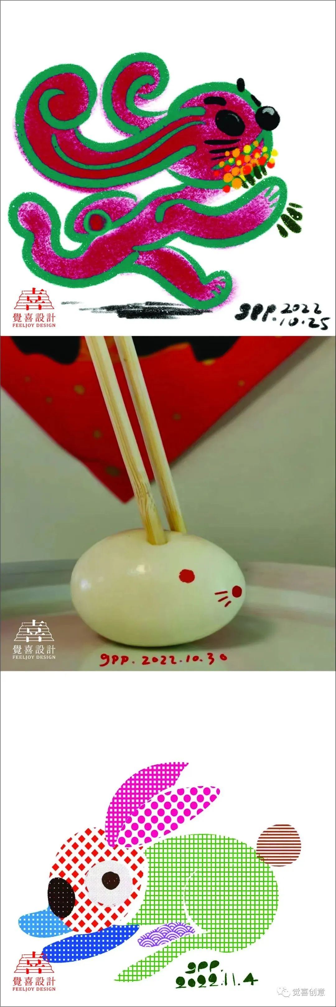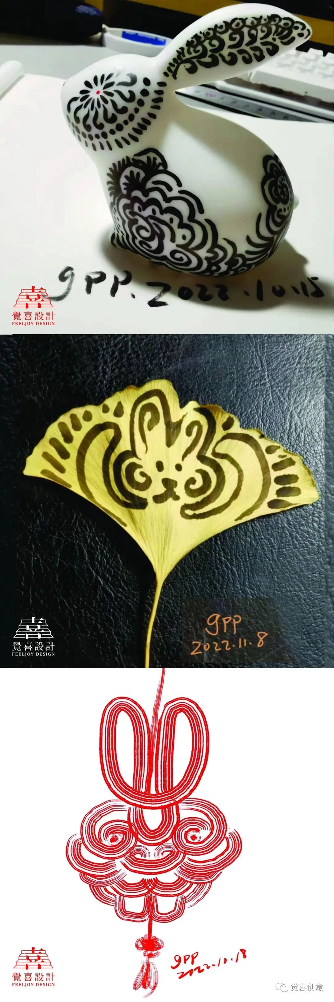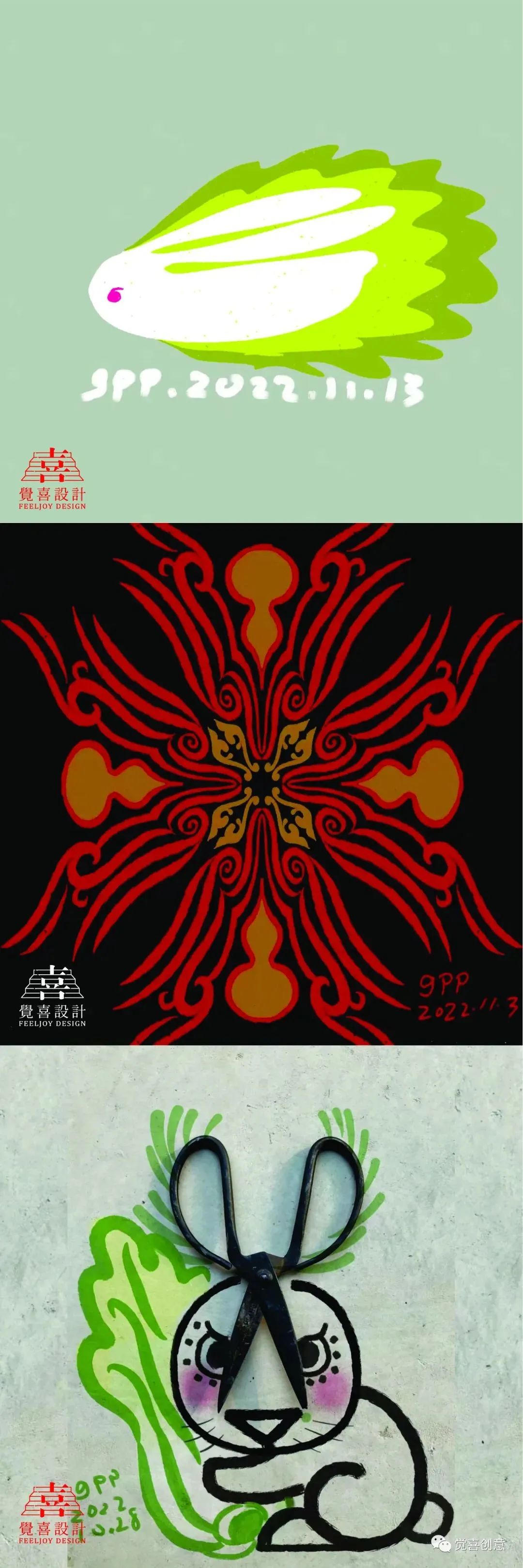 每日一兔中间因为疫情的原因停滞了很久,到本月十号为止,我一共完成生肖兔创意设计89件,这些作品集合在一起,日常的小满足,创意的小惊喜,带孩子的小收获,师友的小鼓励,串联在一起,形成了最值得纪念的设计日常。回顾过往,在这个坚持创意的过程中,无论是亲子互动,还是教学相长,我都收获了很多。感谢深圳龙刚老师、CDS中国设计师沙龙蒋云涛老师,山西大学张国伟老师的欣赏与鼓励,促成年终岁末的“辉兔灵稚-高鹏生肖创意设计主题展,让我有机会把自己的生活中点滴美好展示给大家,感谢我的研究生导师华健心教授百忙之中对此次展出的作品提出宝贵意见,并为展览作序;感谢我的爱人隋津云女士对我一直以来的鼓励与支持,祝愿每一个朋友都可以在2023的每一天都有所收获,幸福平安。