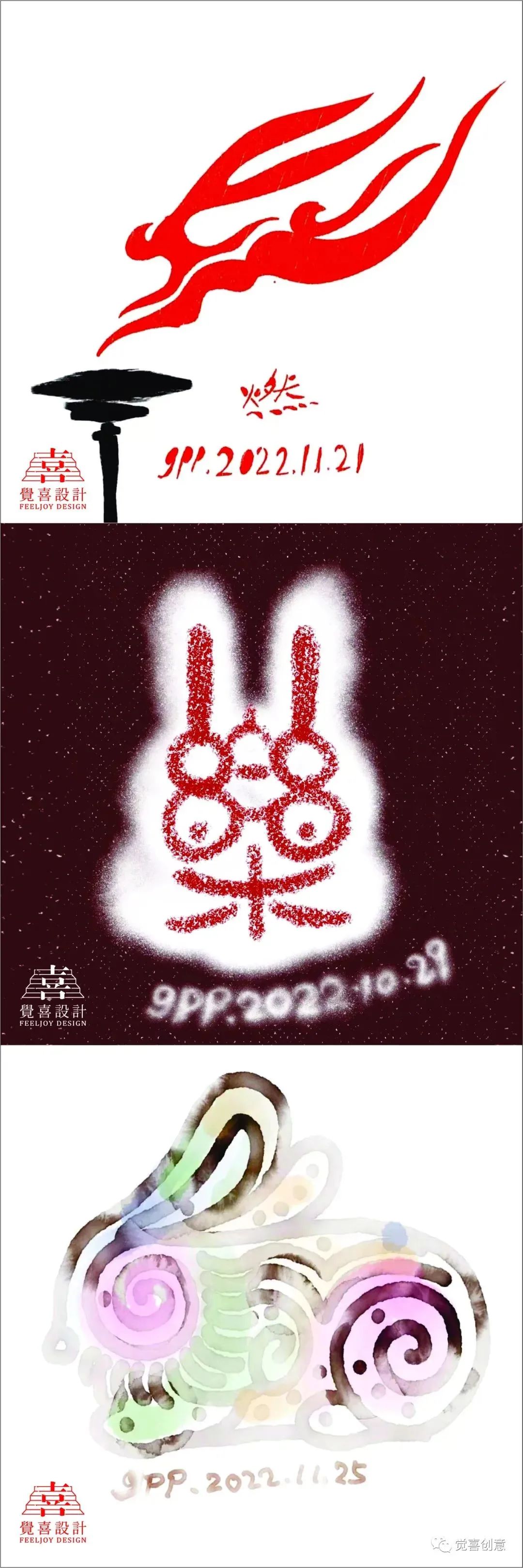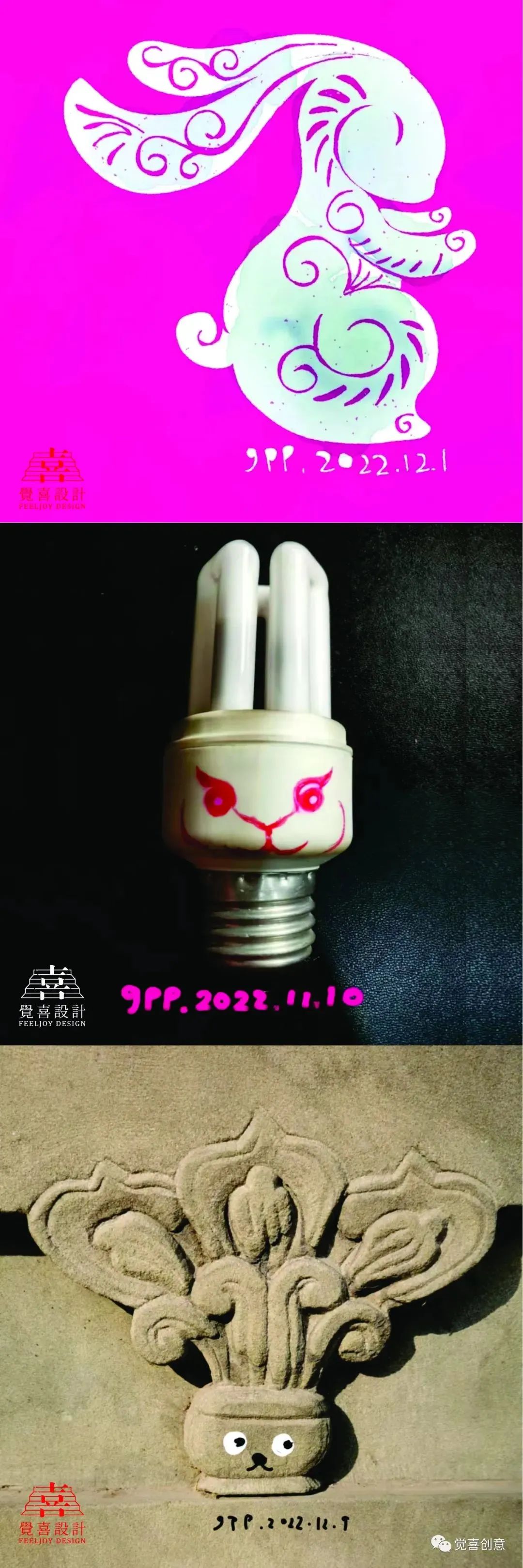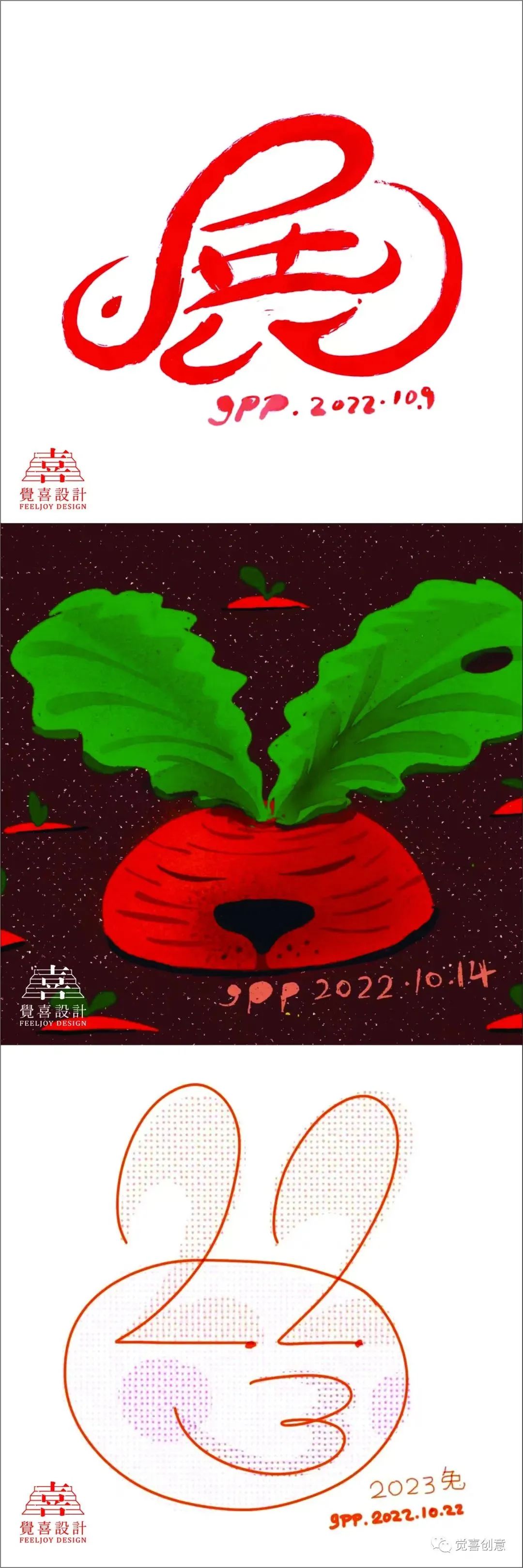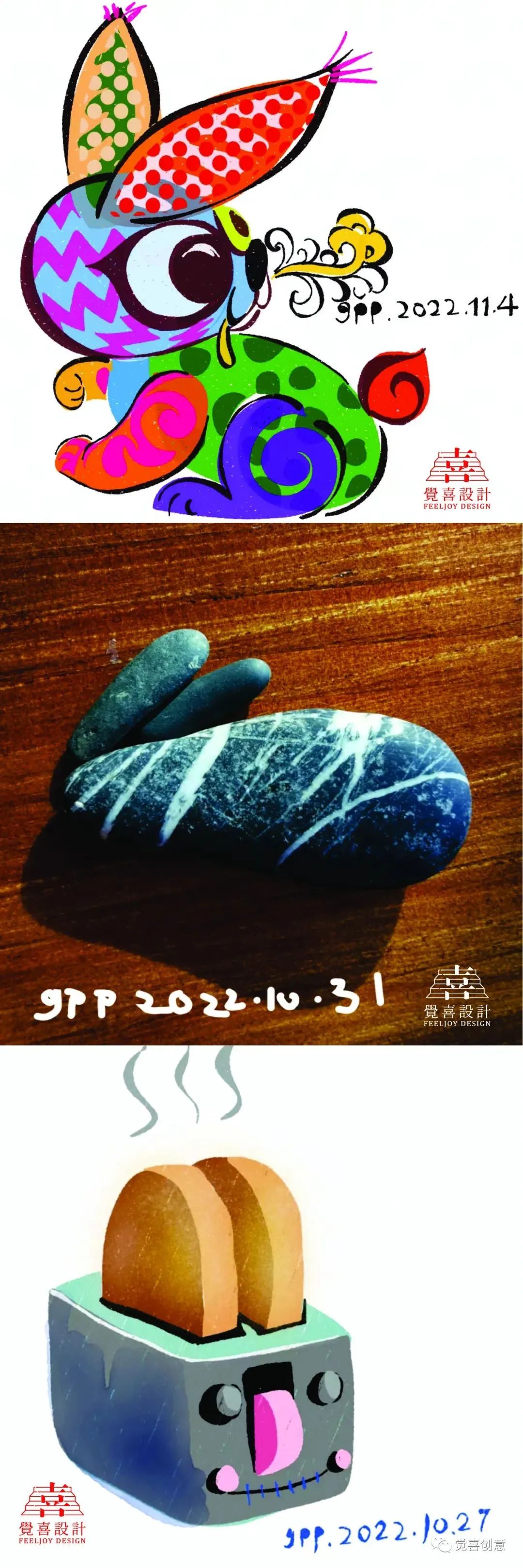 每日一兔中间因为疫情的原因停滞了很久,到本月十号为止,我一共完成生肖兔创意设计89件,这些作品集合在一起,日常的小满足,创意的小惊喜,带孩子的小收获,师友的小鼓励,串联在一起,形成了最值得纪念的设计日常。回顾过往,在这个坚持创意的过程中,无论是亲子互动,还是教学相长,我都收获了很多。感谢深圳龙刚老师、CDS中国设计师沙龙蒋云涛老师,山西大学张国伟老师的欣赏与鼓励,促成年终岁末的“辉兔灵稚-高鹏生肖创意设计主题展,让我有机会把自己的生活中点滴美好展示给大家,感谢我的研究生导师华健心教授百忙之中对此次展出的作品提出宝贵意见,并为展览作序;感谢我的爱人隋津云女士对我一直以来的鼓励与支持,祝愿每一个朋友都可以在2023的每一天都有所收获,幸福平安。