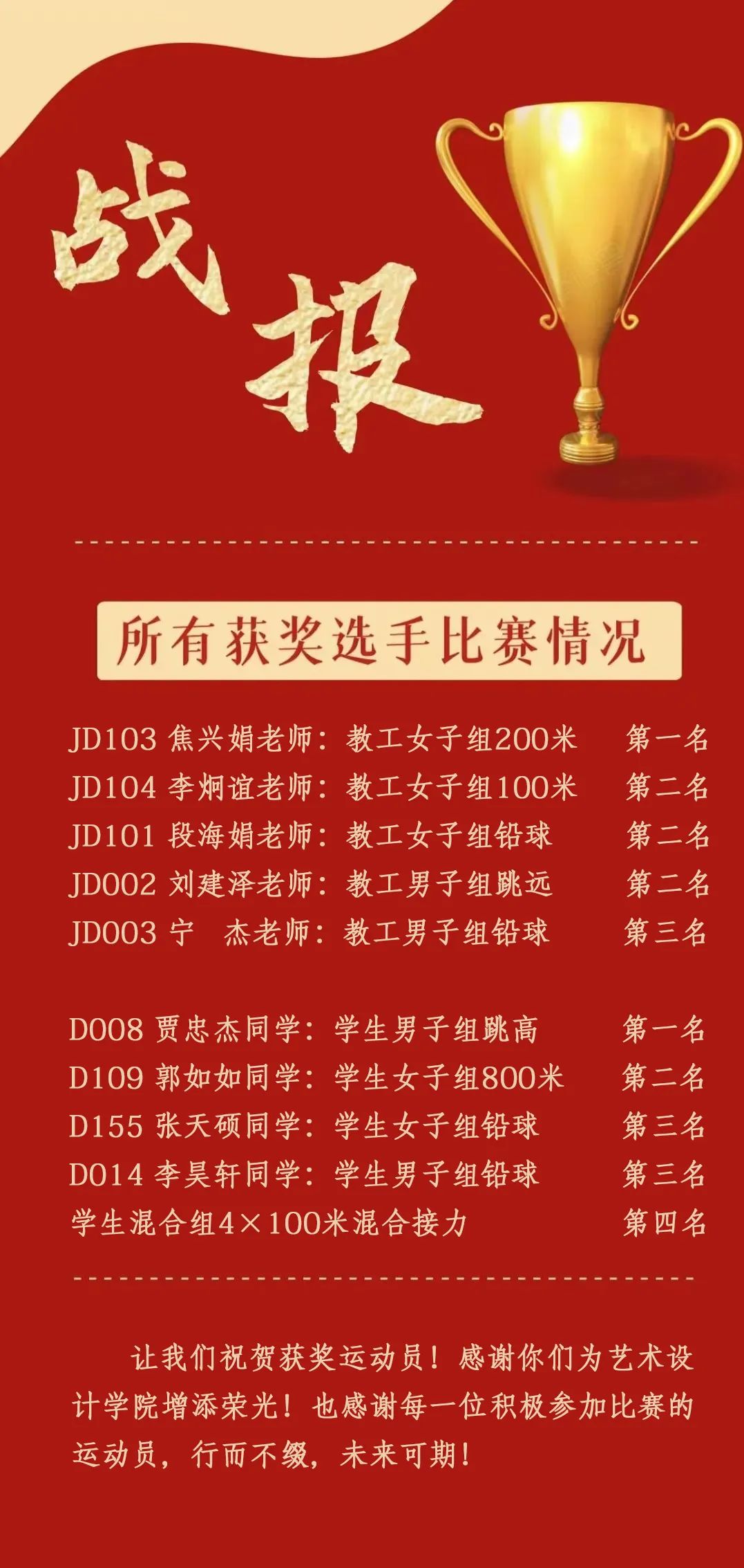 泪水与挫折交融,汗水与欢笑相拥;青春与阳光并肩,激情与呐喊相伴。在我院师生的共同努力下,教工组取得团体第二名的好成绩,学生组取得道德风尚奖。相信我院师生会一直秉承奋力争先的运动精神,继续努力,不负韶华!