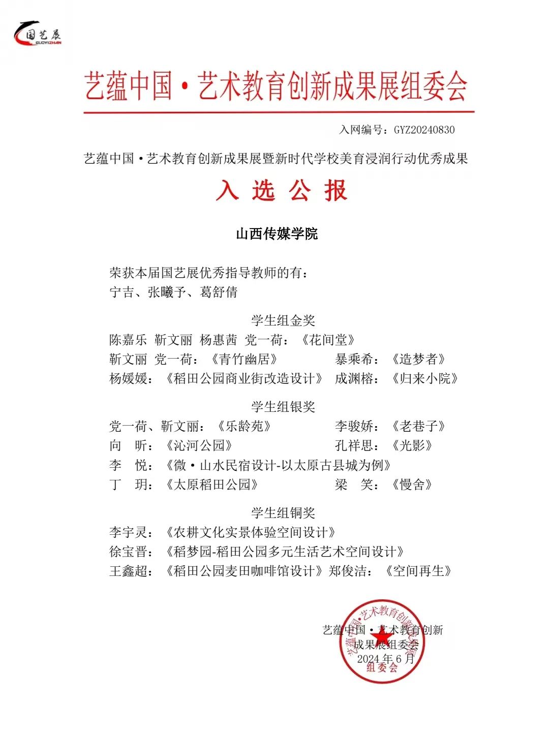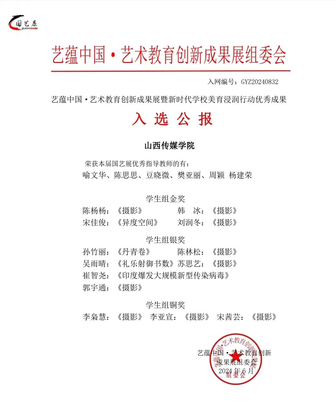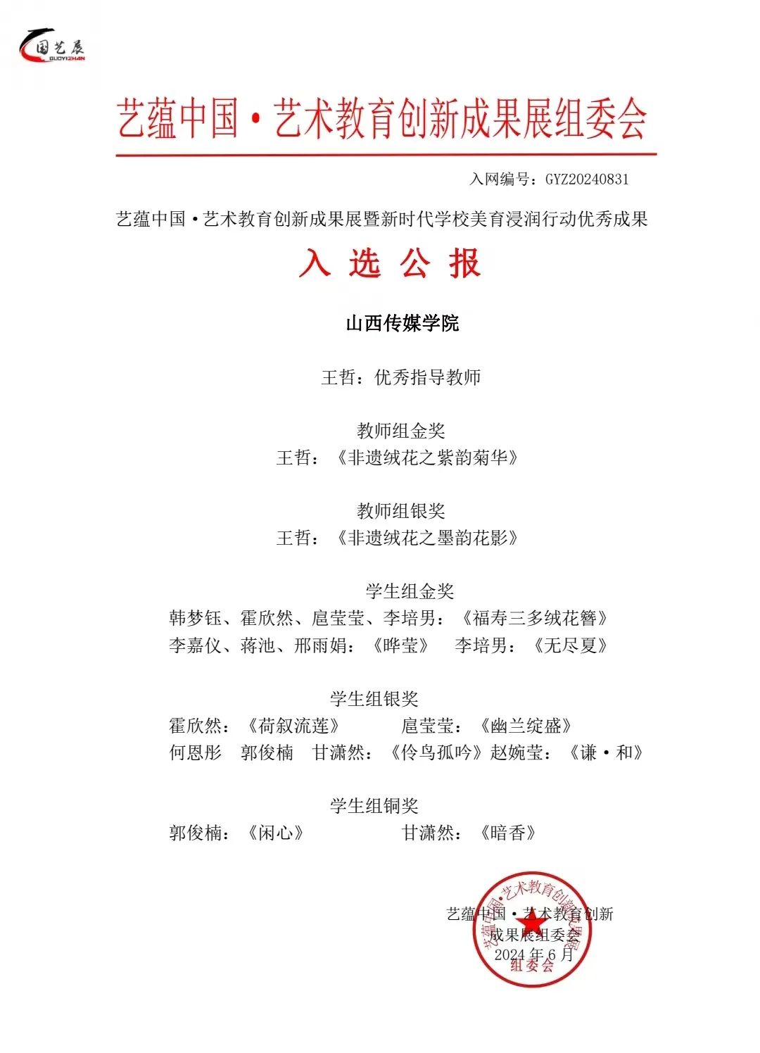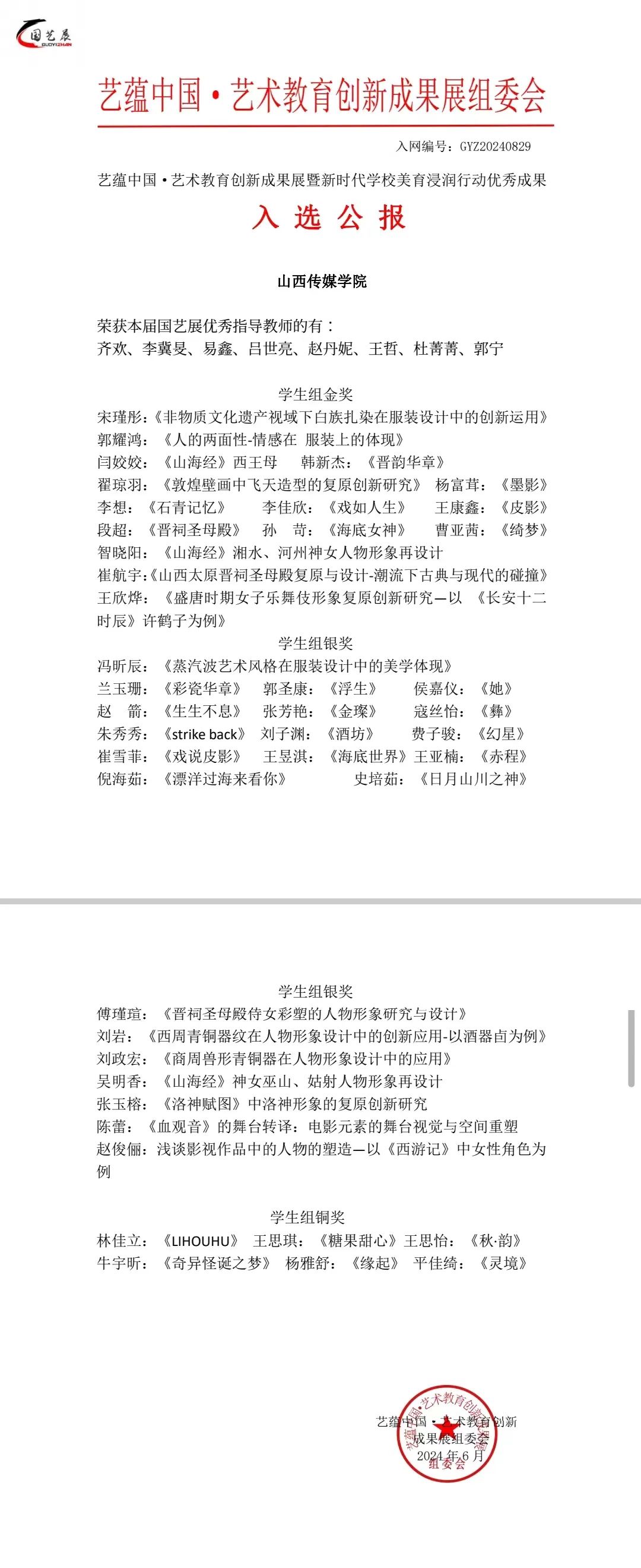 我院师生在“艺蕴中国·艺术教育创新成果展暨新时代学校美育浸润行动”比赛中斩获佳绩,其中学生组金奖作品27个,银奖作品39个,铜奖作品15个。教师组金奖作品1个,银奖作品1个,优秀指导教师共18名。