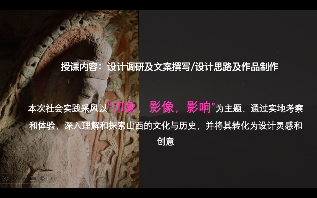 在采风过程中,学生们不仅仅满足于单纯的观察,还积极运用摄影、绘画等多种方式,记录下每一处能够激发创作灵感的场景与细节。此外,课程特别增设了设计调研与设计文案撰写的辅导环节,旨在引导学生们更为系统地整理、深入挖掘设计背后的创意构思与思想来源。这不仅丰富了学生们作品的文化底蕴,更提升了其作品的情感感染力与艺术表达力,增加设计深度,使得每一件作品都能更加生动、深刻地传达出山西文化的独特魅力。