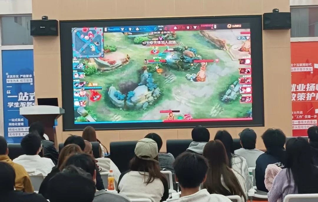 朱柯羽老师、王潇阳老师邀请其他老师组建成一支老师队伍,与同学们进行师生友谊赛,飘逸的走位和神奇的操作不断在直播画面上呈现,解说员激情而有条理的解说比赛过程,现场气氛一度在各种精彩的表现中达到高潮,有同学们或坐或站,目光齐聚大屏幕上,也有同学拉着老师或其他同学在角落里选择再PK一局,企图秀出精彩的表现。直至冠军队伍出现,本次趣味运动会暨“第一届艺设电子竞技赛”圆满落幕。