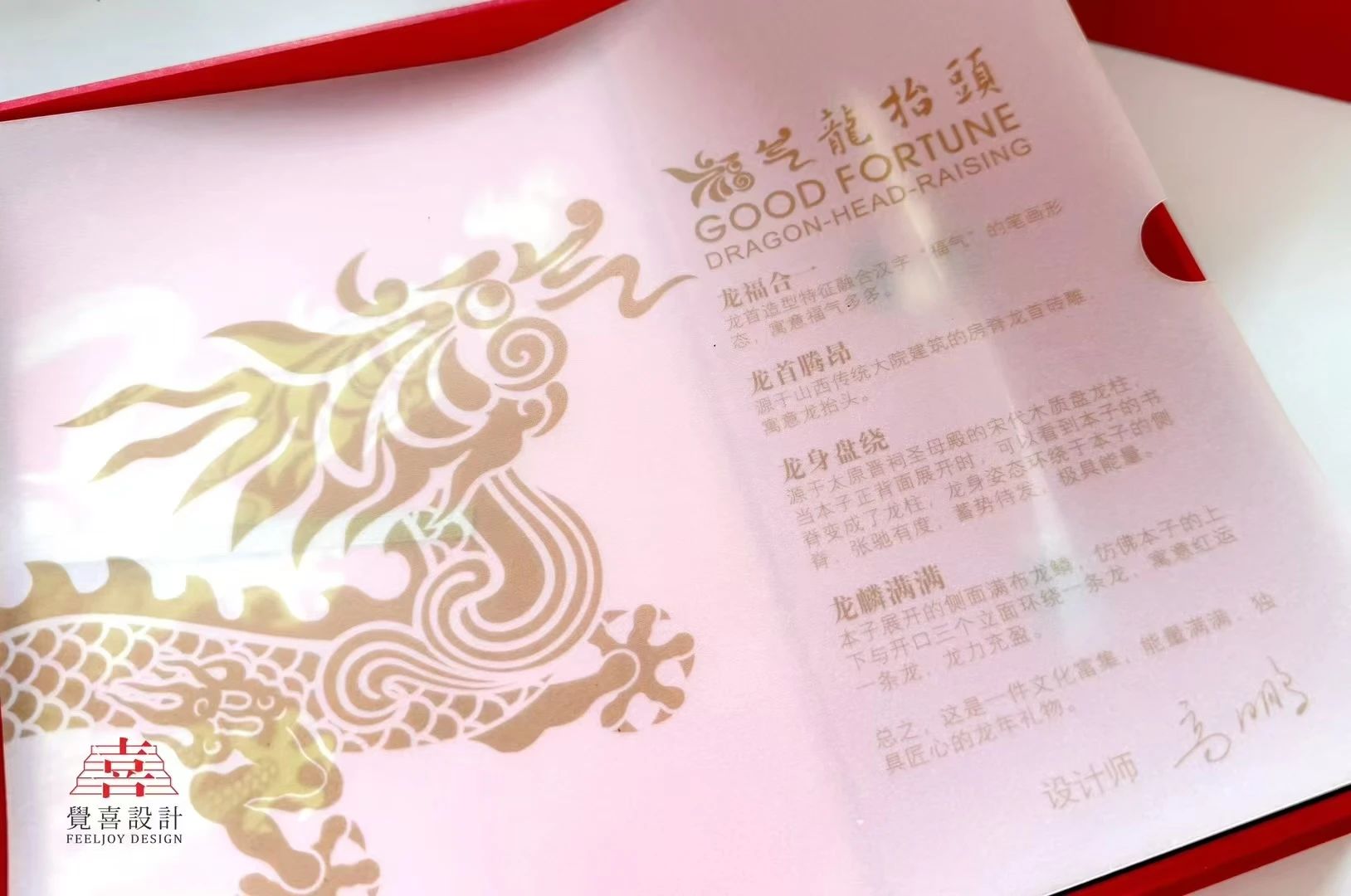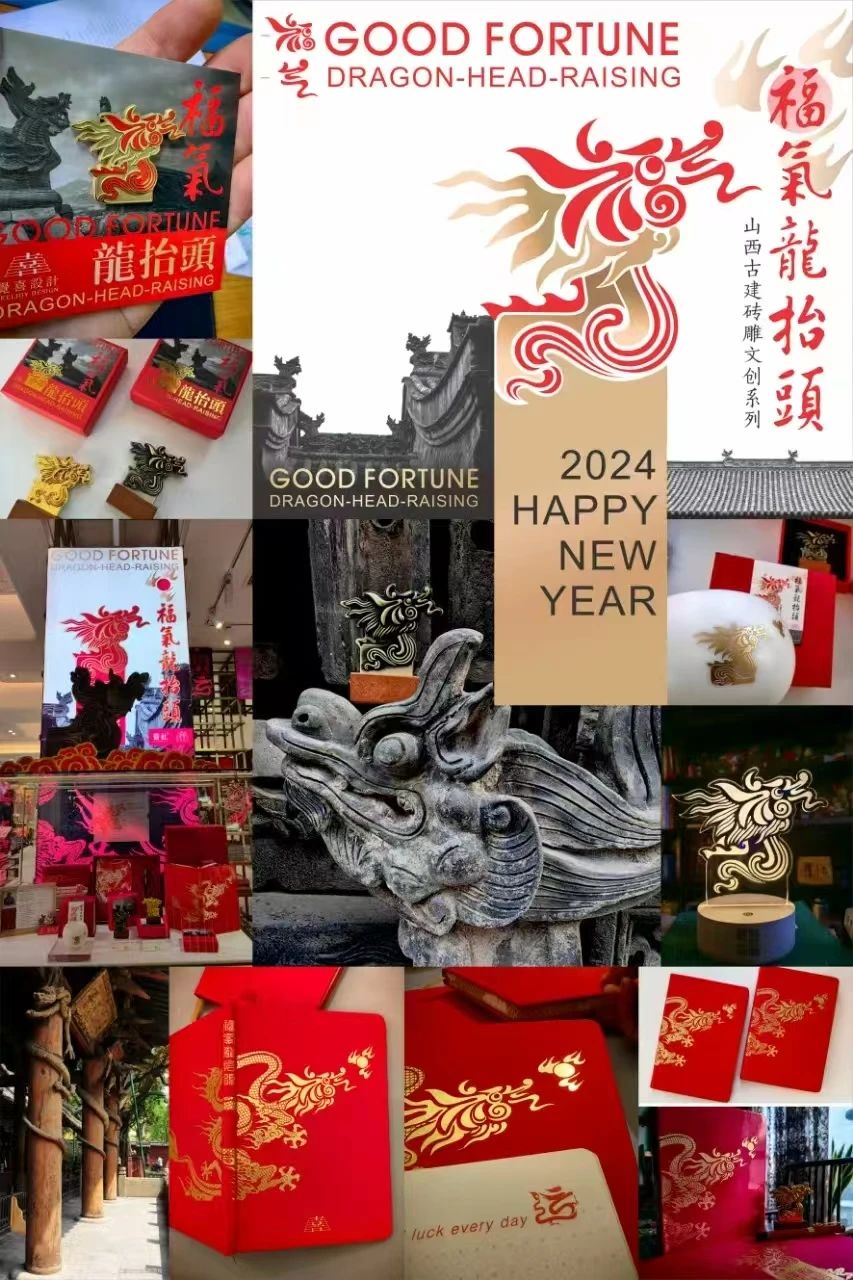 此次入选的《福气龙抬头文创系列》创意独特,融合了丰富的传统文化元素。龙首造型灵感源自山西大院房脊上的龙首砖雕,以昂首龙腾之姿寓意龙抬头;龙身姿态则借鉴了太原晋祠圣母殿宋代木质盘龙柱的形态,当文创本子正背面展开时,书脊幻化为龙柱,龙身蜿蜒其上,环绕本子侧脊,张弛有度,蓄势待发,尽显蓬勃能量。本子展开侧面印有龙鳞,从三个立面看,仿佛有龙环绕,寓意“红运一条龙,龙力满满”。而本子封面的龙头造型巧妙融合了汉字“福气”的笔画形态,传递出“福气满满”的美好寓意。