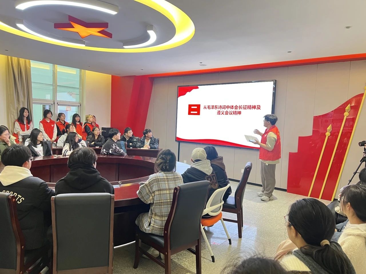 宣讲团成员贾晋超带领同学们赏析毛泽东诗词,结合长征历史背景,体悟革命者的坚定信仰。他还通过遵义会议的故事,引导大家思考如何在新时代传承和发扬这一精神,以实际行动践行初心使命。