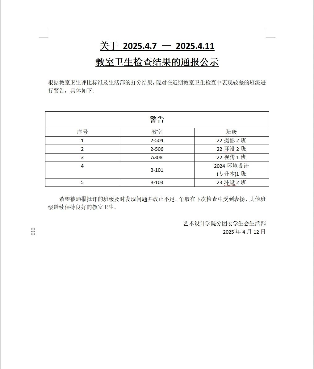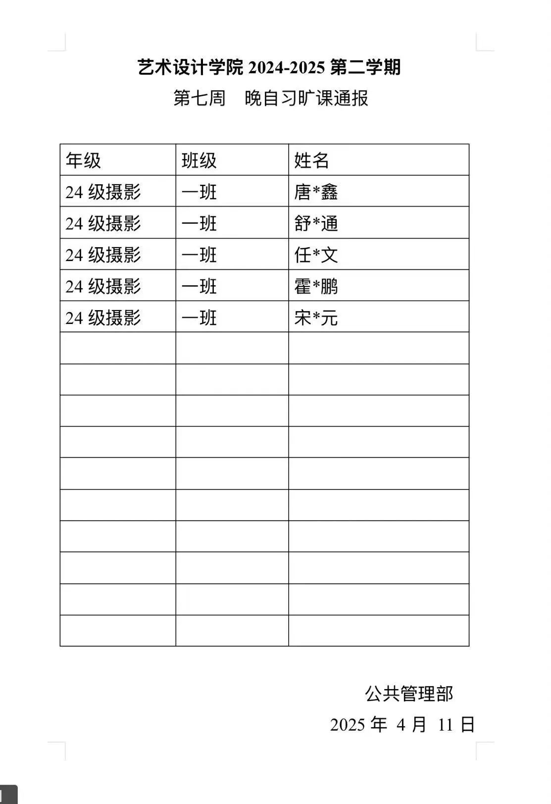 为营造"求知向善、勤勉好学"的学习氛围,构建"安全和谐、文明规范"的校园环境,我院学生会紧抓学风建设工作,深入反馈巡查效果,现将2024-2025学年第二学期第七周学风与文明行为规范巡查情况通报如下: