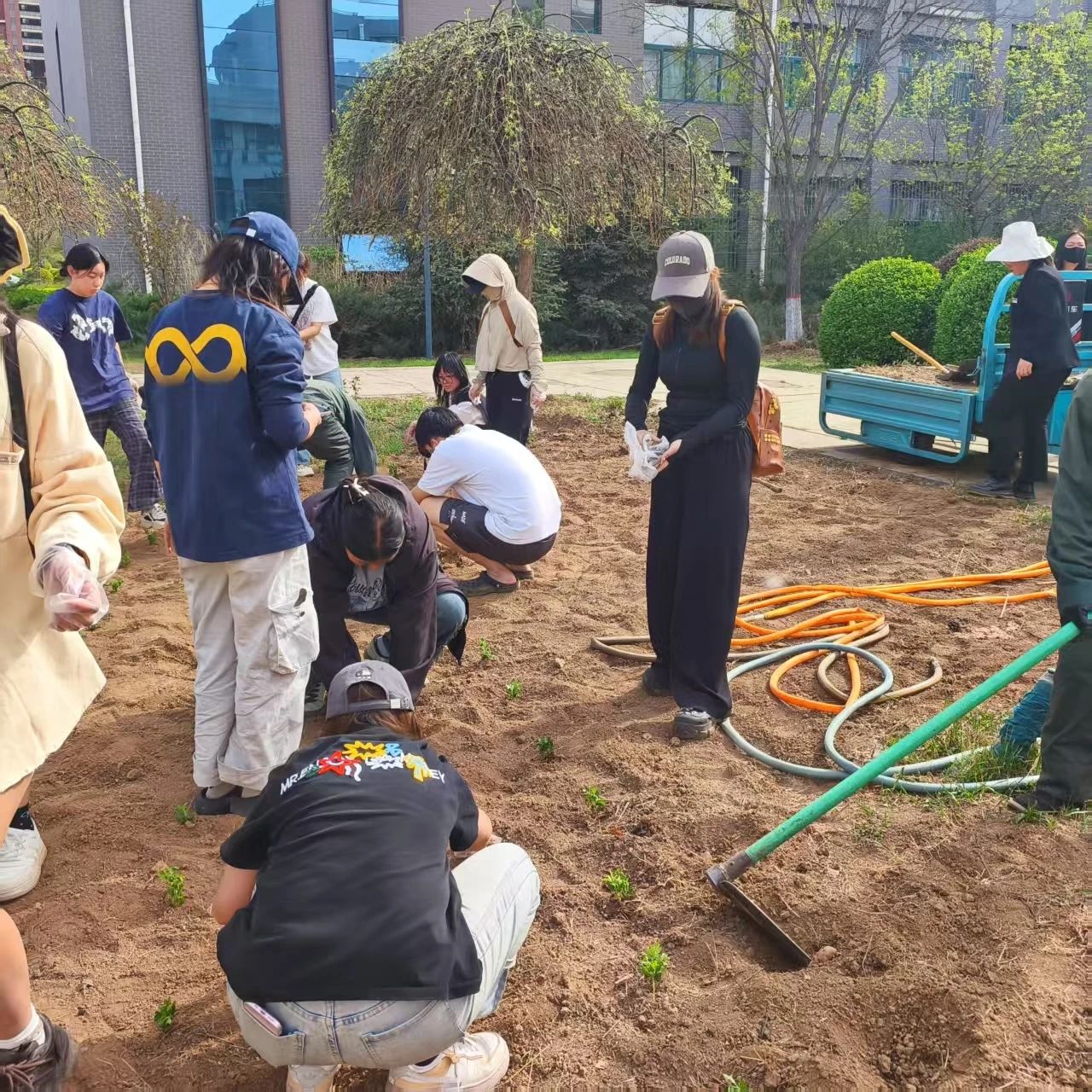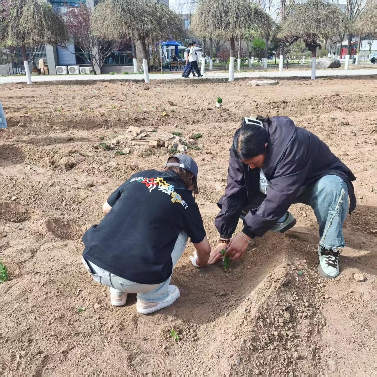 同学们栽种了一排排树苗,在春风中沐浴,我们共同期待它们的成长。