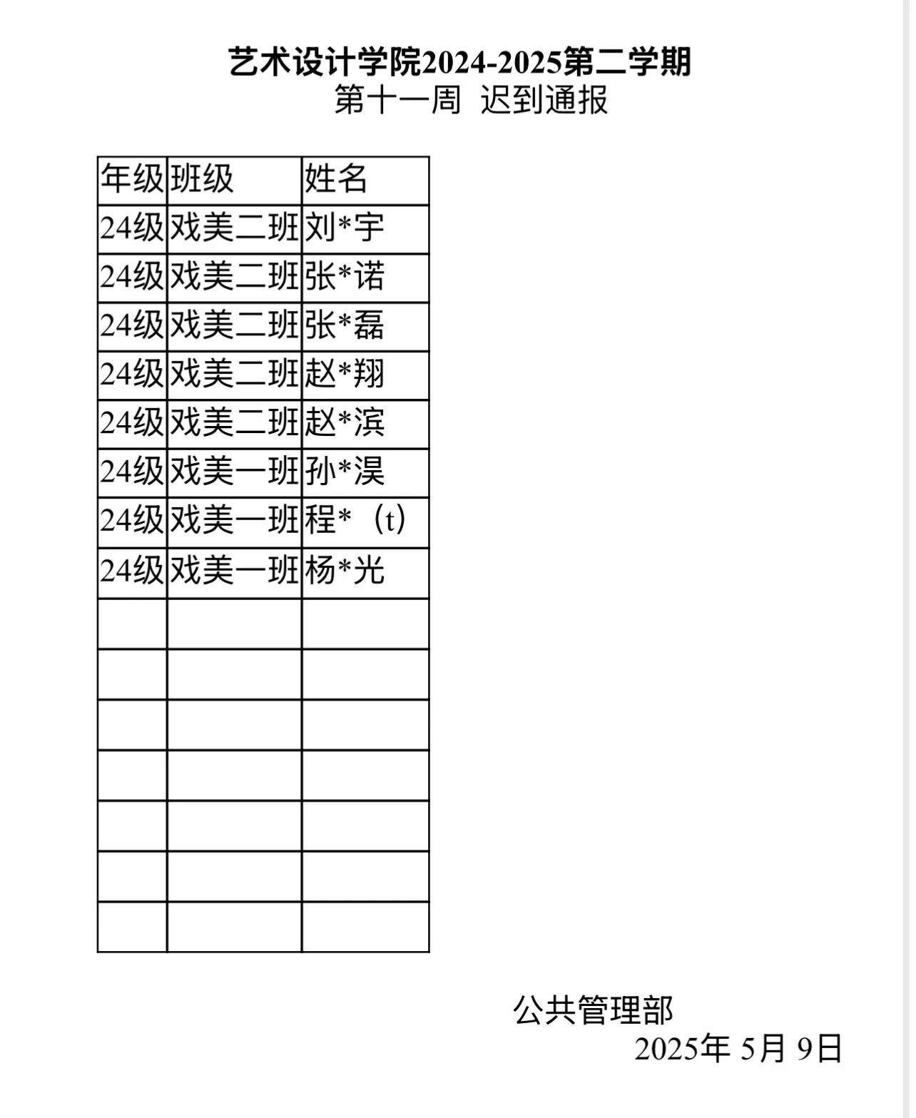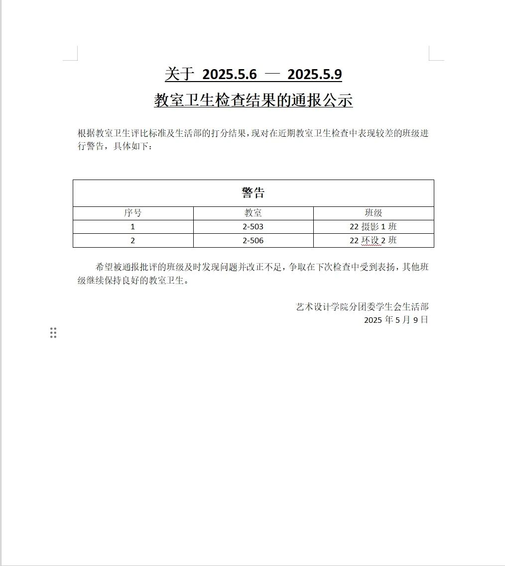 为营造“求知向善、勤勉好学”的学习氛围,构建“安全和谐、文明规范”的校园环境,我院学生会紧抓学风建设工作,深入反馈巡查效果,现将2025学年第二学期第十一周学风与文明行为规范巡查情况通报如下: