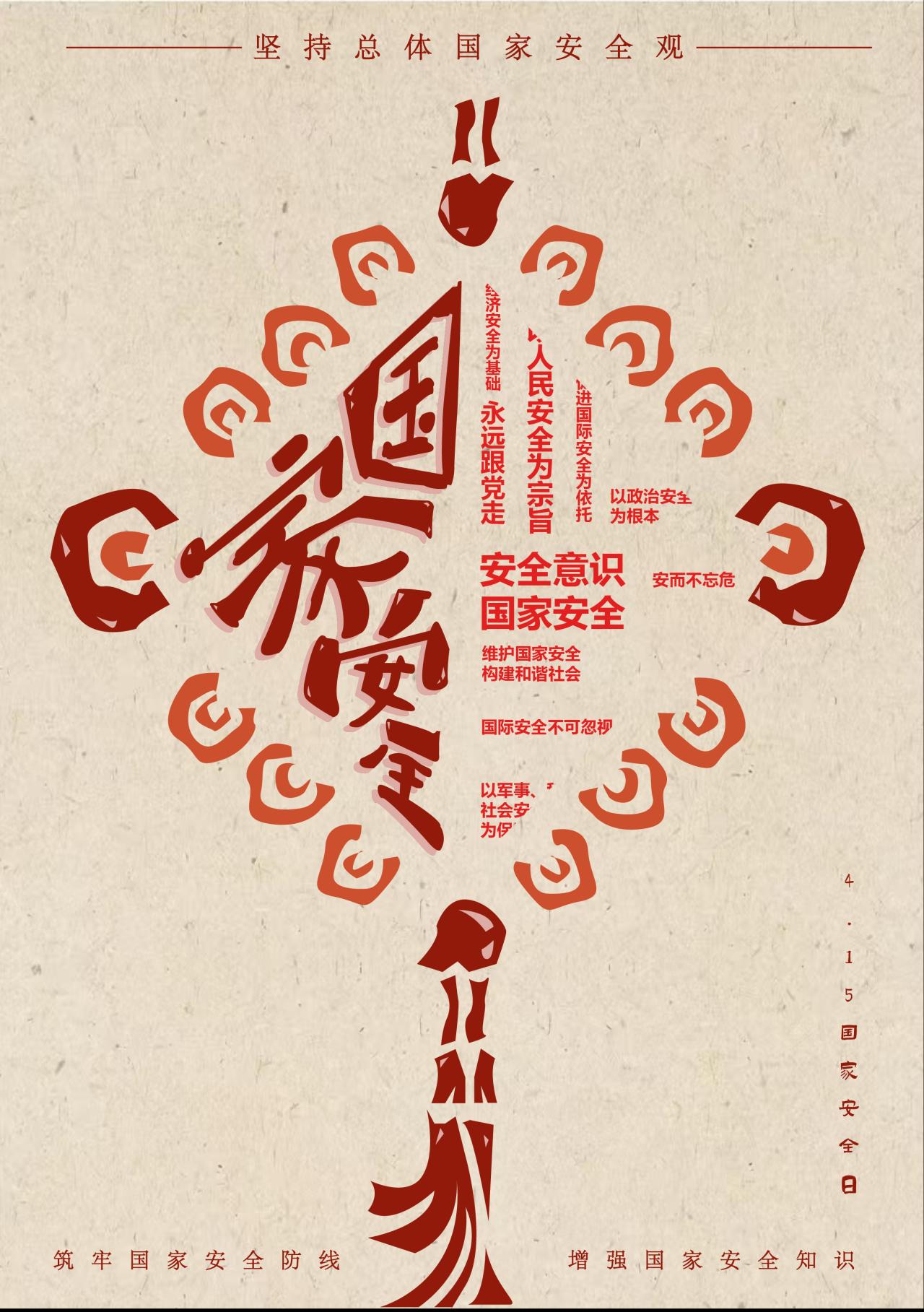 设计说明:海报以艺术化“国家安全”四字为核心,融合传统纹样设计,占据视觉中心。周围放射状线条隐喻理念辐射传播,强调人民安全为宗旨、政治安全为根本,凸显安全与社会和谐、国际安全的关联。设计旨在警示公众居安思危,强化安全意识,共筑防线,构建稳固和谐的社会安全体系。