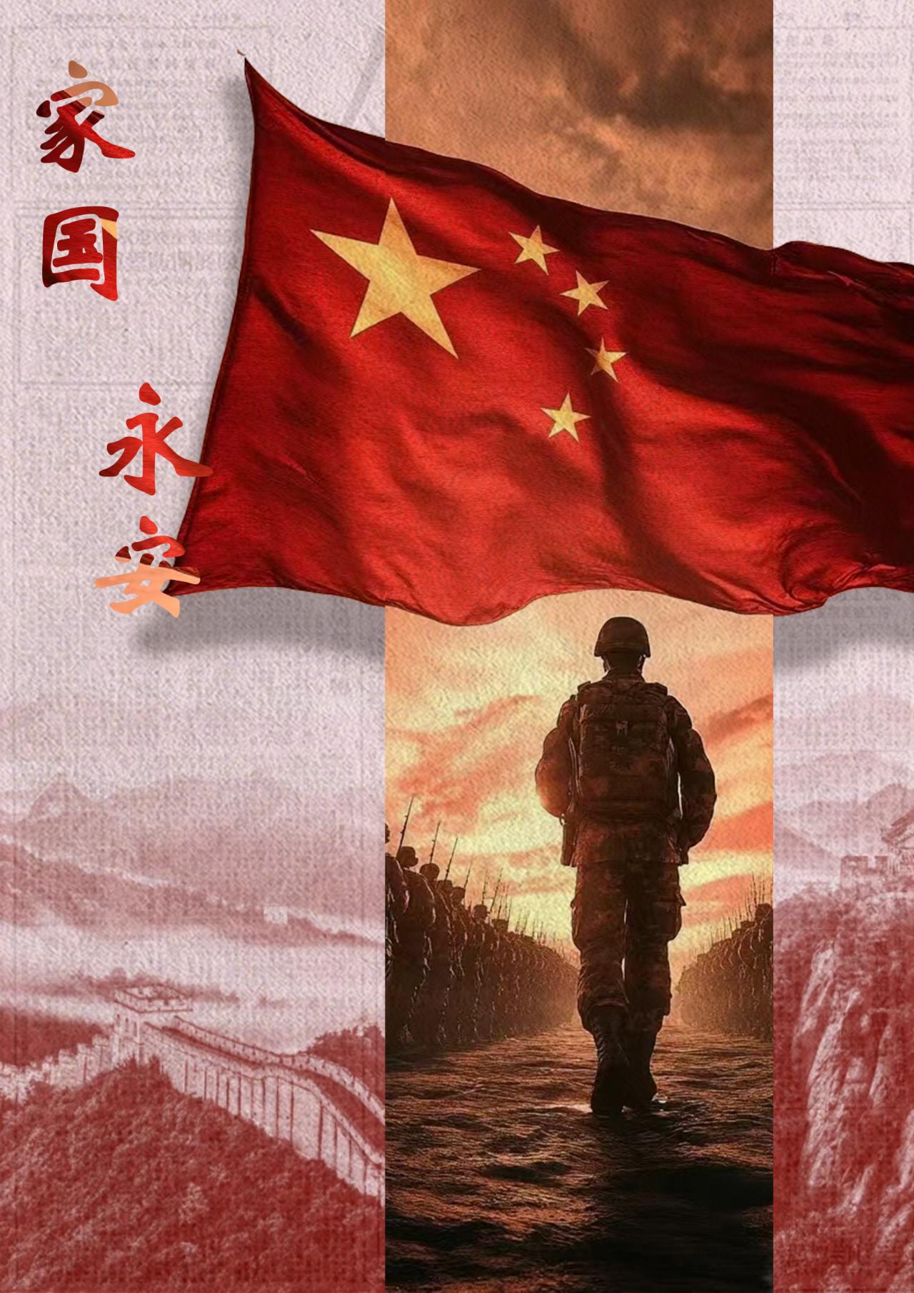 设计说明:海报以五星红旗为核心,红黄主色彰显国家主权与尊严。军人坚毅背影与蜿蜒长城构成视觉主线,前者象征保家卫国的使命担当,后者作为民族精神图腾暗喻坚韧守护,二者呼应强化家国守护主题。"家国永安"四字以苍劲书法点题,"家""国"相连彰显传统价值观,"永安"二字寄托和平祈愿。红金主调呼应国旗,暖色天际晕染出庄重与希望交融的意境,整体以刚柔并济的视觉语言,传递出对家国安宁的深情礼赞与文化认同。