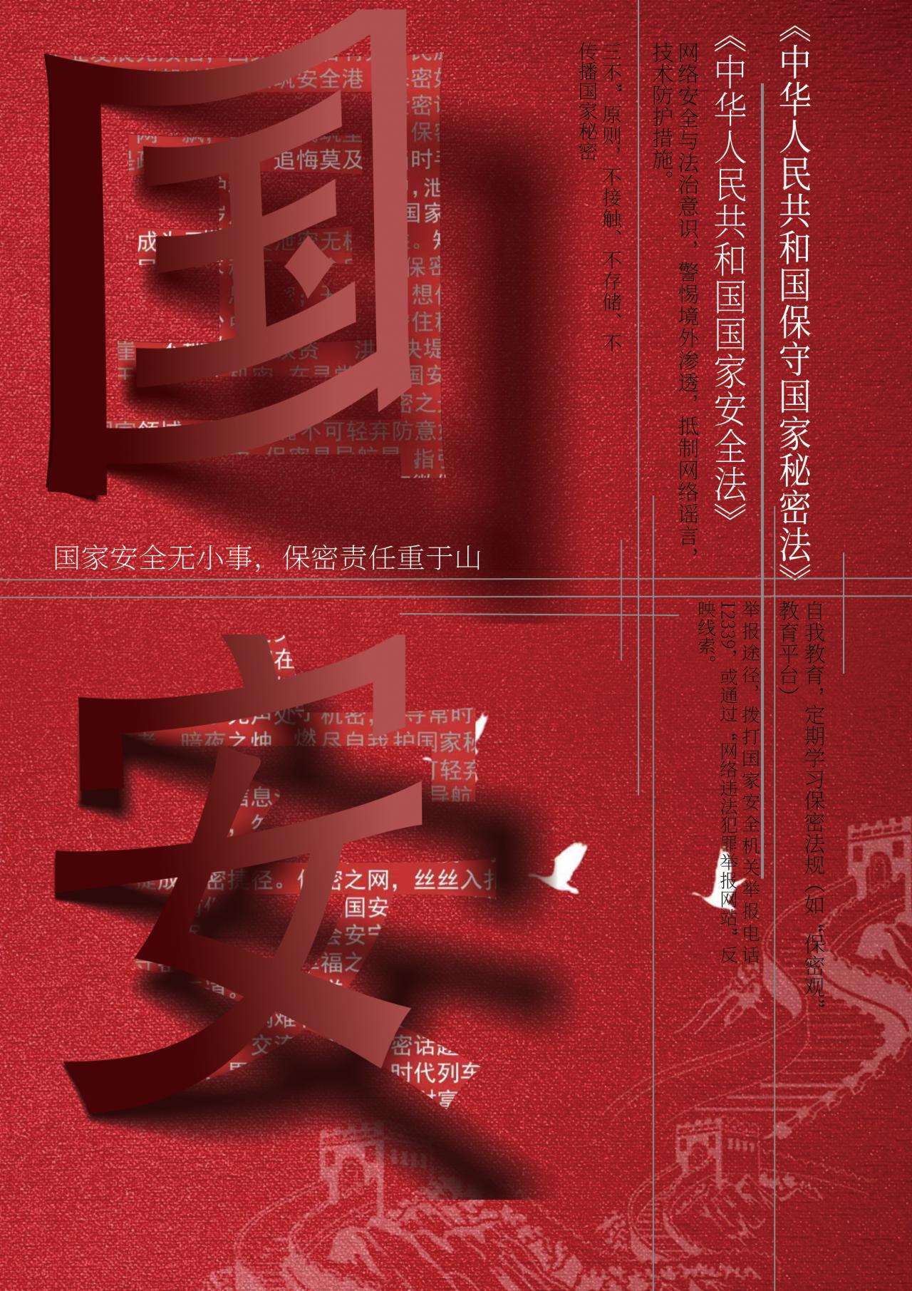 设计说明:海报以国家安全与保密为主题,以《保守国家秘密法》《国家安全法》为法理根基,凸显法治底线。设计以庄重红调营造严肃氛围,立体“国”“安”二字嵌“保密”“防线”等词直击核心。背景融合长城与白鸽,象征以铁志守护和平。画面分区展示网络安全、法治意识、“三不”原则、举报途径及自我教育要点,辅以显眼法条名称与中心标语“国家安全无小事,保密责任重于山”,强化全民守卫使命。