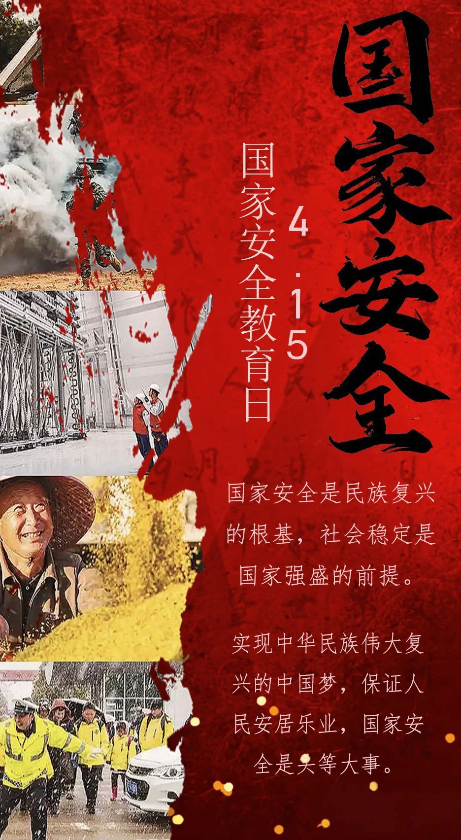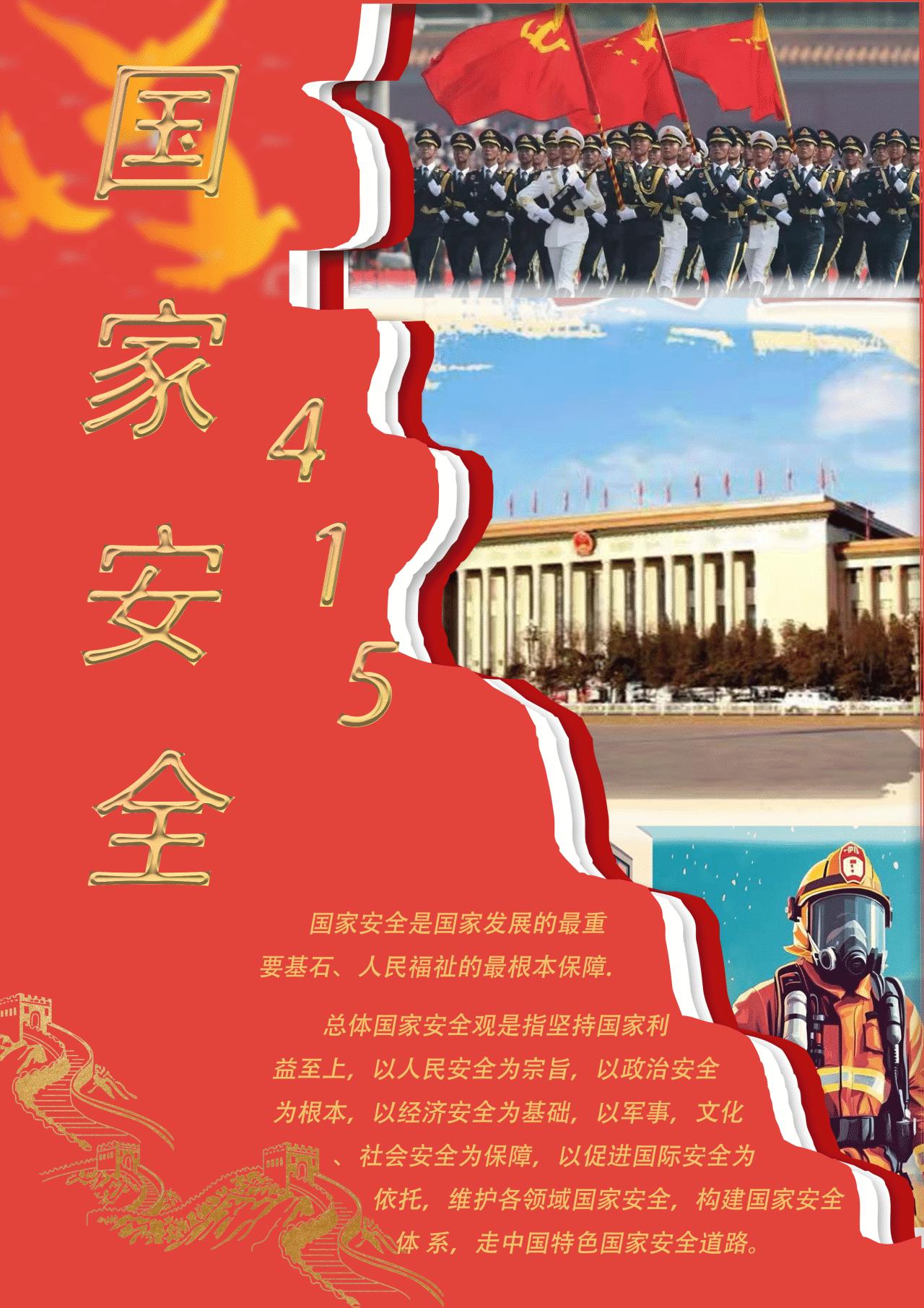 设计说明:作品的左半部分是为了国家安全奋斗在不同领域的英雄人民。我想表达在我们所有幸福的背后都是不同领域的人共同努力以及在党的领导和国家支持才有的。我们所有的一切,都是以国家为根基,以国家为靠山,没有国家安全也就没有我们现在的国泰民安。左半部分是国家教育安全日的时间,以及习近平总书记总体国家安全观相关论述。