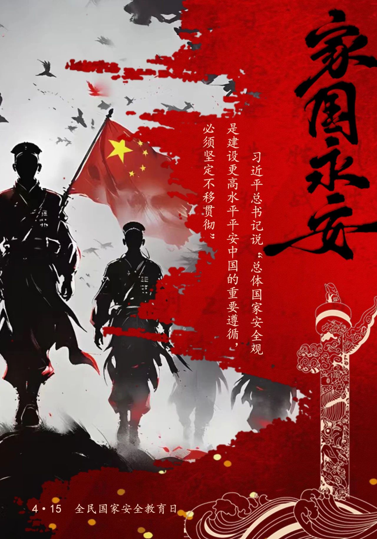 设计理念:该海报设计以“坚持总体国家安全观,筑牢新时代安全防线”为核心,将笔墨化作战士形象,隐喻文字与文化在国家安全领域的守护力量。整体设计通过古今呼应,展现新时代每个人都是国家安全防线的“文化战士”,号召以思想与行动筑牢全民安全屏障,守护国家长治久安。