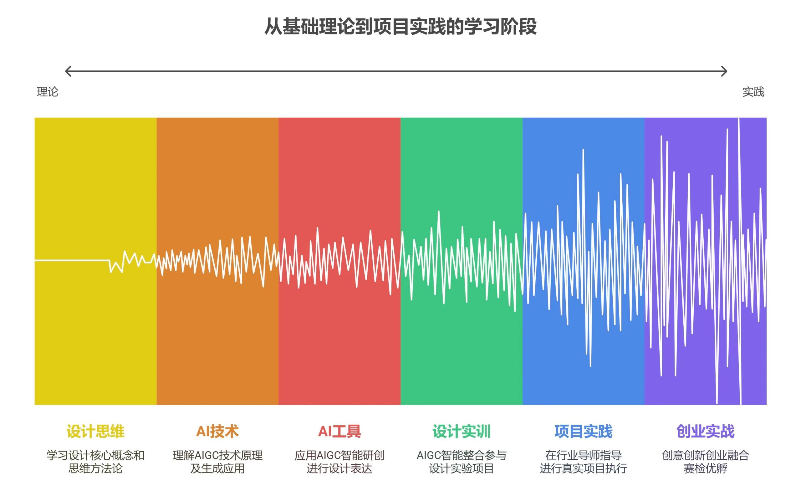 课程体系以设计思维为核心逻辑,覆盖AIGC关键原理、AI Agent工具应用与智能创作流程,采用项目制教学与任务驱动模式,贯穿“创意生成—技术实现—用户验证”全过程。通过企业真实项目参与、文化IP共创、竞赛孵化等教学环节,学生将系统构建“思想+技术+传播”的复合能力矩阵,全面提升其创新设计力、跨界协同力与创业实践力,成长为适应智能化时代的高素质创意人才。