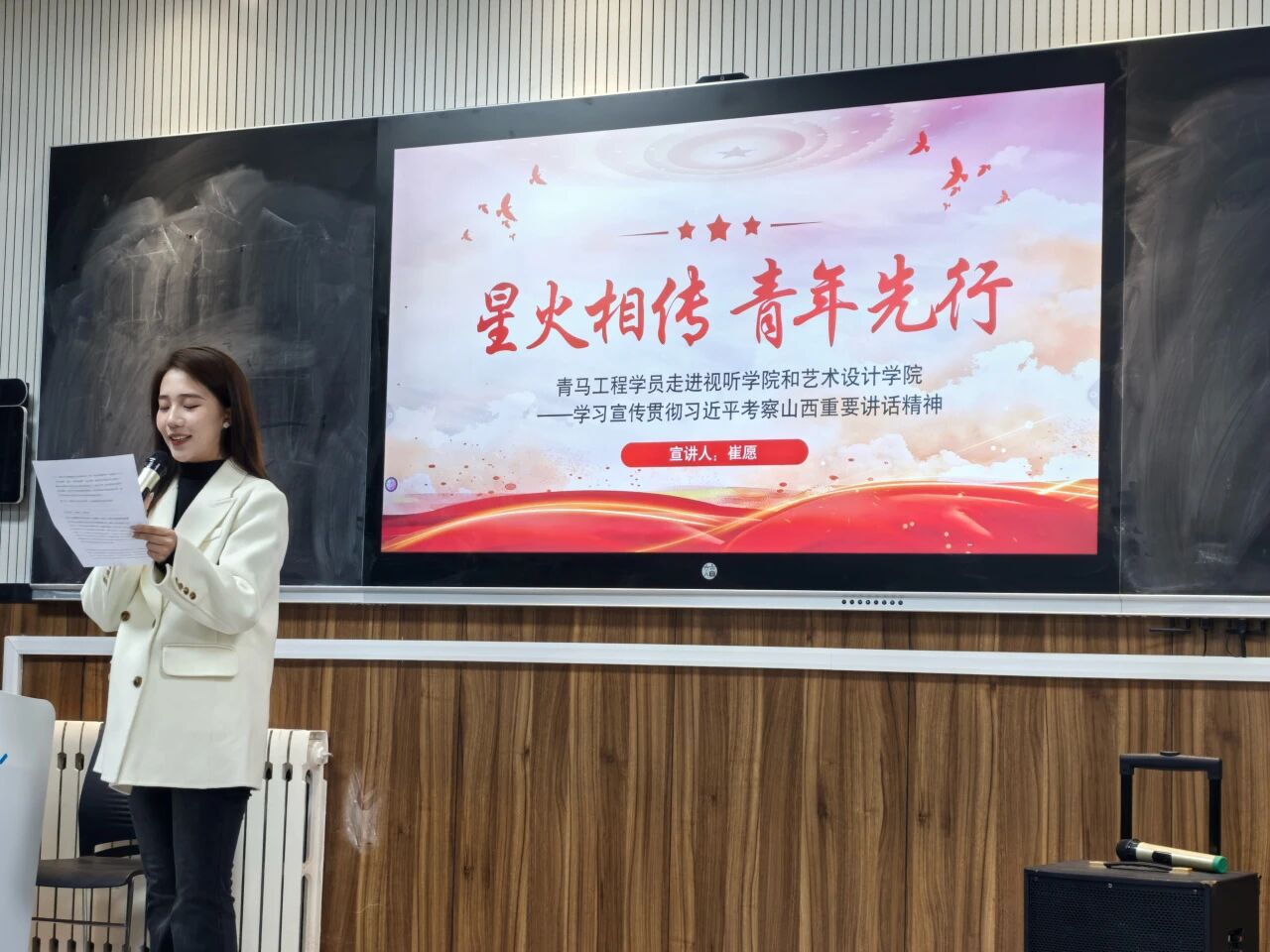 崔愿同学的宣讲以 “晋北清风” 为文化内核、时代脉搏为主线,从战略、产业、红色传承、党建等维度,用生动案例展现了山西转型的多元之美,为艺术与视听创作提供了宝贵源泉。总书记强调传统产业需靠科技创新焕发新活力,艺术与视听正是传播这份 “新活力” 的关键。作为相关学院师生,我们要以创意赋能发展,将山西转型实践与文化底蕴转化为视觉设计、纪录片等作品,让山西故事广泛传播。让我们以此次宣讲为契机,贯彻总书记考察山西重要讲话精神,用设计与镜头记录奋进瞬间,为山西中国式现代化建设贡献创意力量。