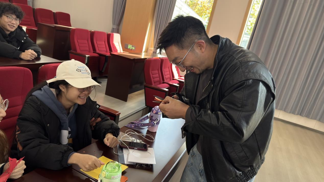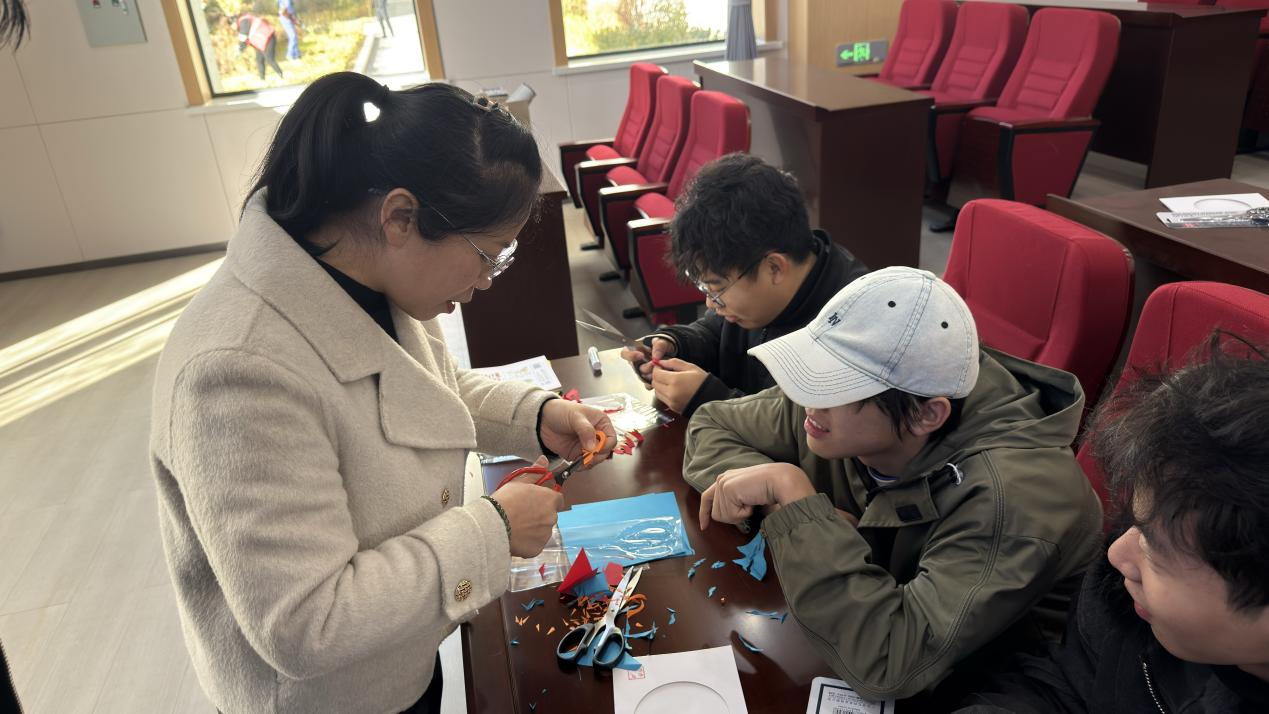 实操教学环节,胡老师从纸张折叠的角度、剪刀下刀的力度,到纹样设计的对称美学,逐一进行细致示范。同学们专注聆听、认真记录,遇到疑问及时举手请教,老师耐心驻足指导,手把手纠正裁剪手法。