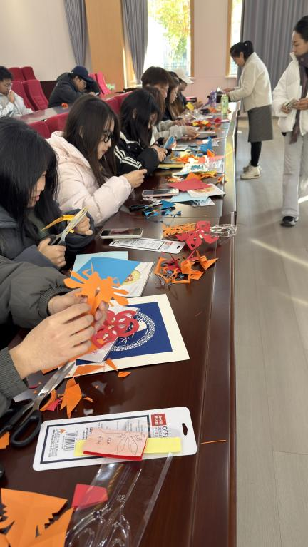 原本略显生涩的剪刀在指尖逐渐灵活,有的同学尝试剪刻传统吉祥纹样,有的则结合专业特色融入现代设计元素,教室内不时响起阵阵赞叹声,氛围热烈而温馨。 实践环节里,大家手持剪刀、红纸,在老师的耐心指导下折、剪、刻、挖,从简单的纹样尝试到完整的作品成型,指尖翻飞间,一张张普通的红纸逐渐蜕变为灵动的艺术佳作,教室内满是创作的热情与成就感。