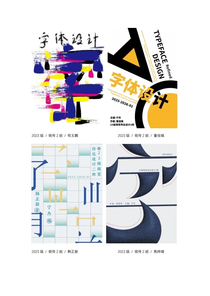 本课程通过理论与实践相结合的教学方式,系统覆盖了字体设计的基础理论、创意方法与实践应用,完成了系列递进式的作业任务。学生在课程学习过程中,不仅夯实了字体设计的专业基础,提升了创意设计与版式编排能力,更在创作中深化了对中华优秀传统文化的理解,增强了文化自信与家国情怀。结课画册作为课程成果的集中展现,既检验了学生的专业学习效果,也培养了学生的成果整合与系统表达能力。后续,课程将根据学生的学习反馈与作品表现,进一步优化教学内容与教学方法,加强实践教学环节的针对性与创新性,更好地衔接行业需求与专业发展,助力学生成长为兼具专业素养与文化内涵的视觉传达设计人才。