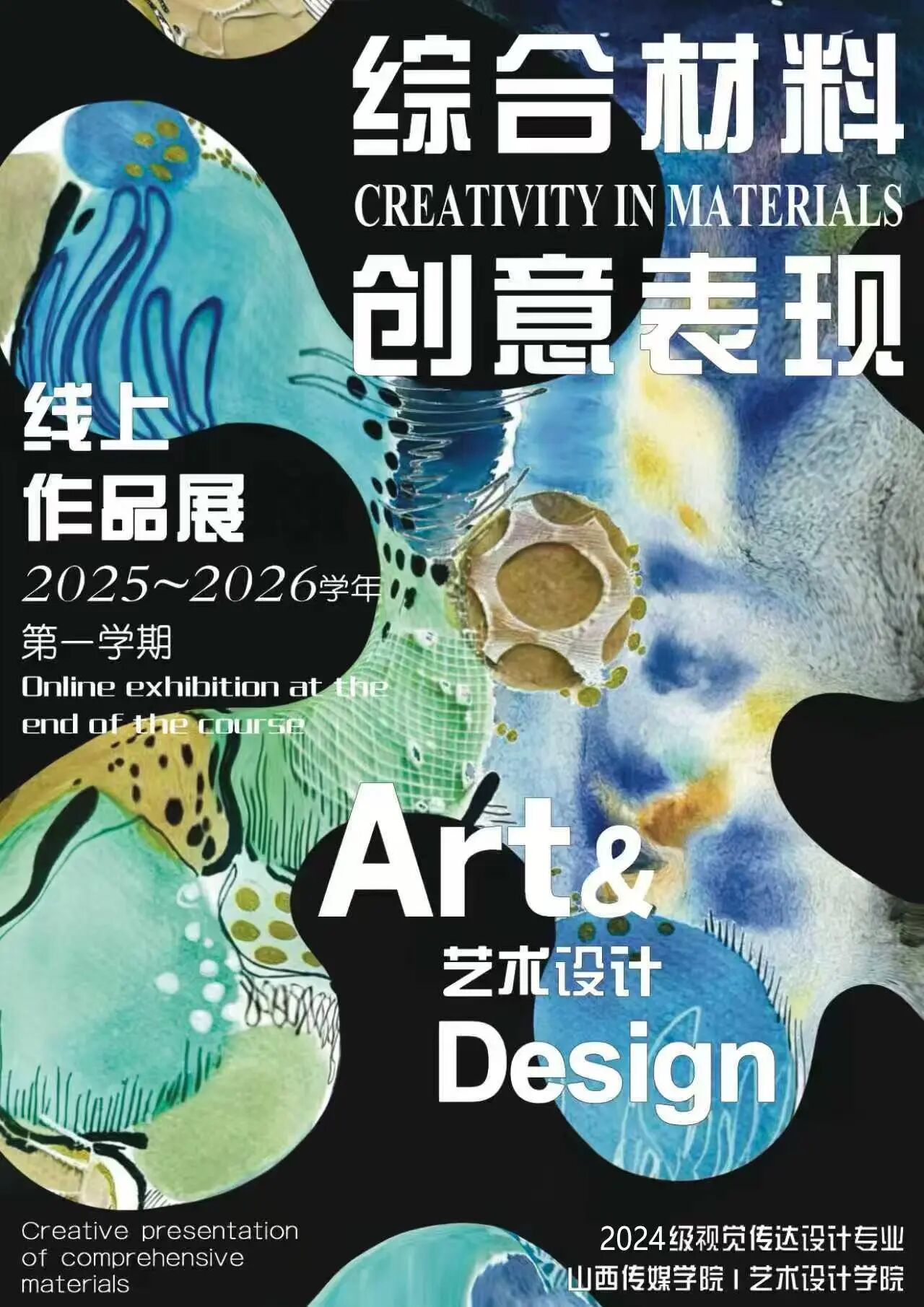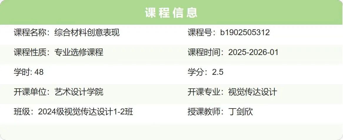 《综合材料创意表现》是一门以材料思维为核心的形式语言探索与实践课程。通过选取并实践创作材料及方法,拓宽学生的设计视野与多维思考能力。学生们从认识材料、尝试分解材料,到重组材料、掌握运用,逐步构建起在视觉传达设计领域中材料语言的认知体系,帮助学生确立正确的价值观和创新理念,也为后续字体设计、海报设计、卡通吉祥物设计等课程奠定坚实基础。