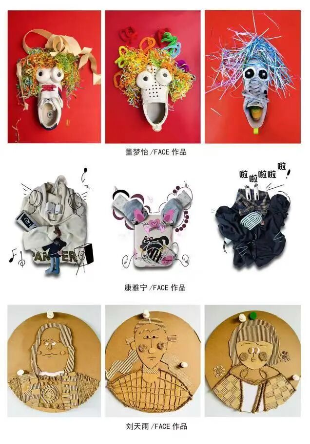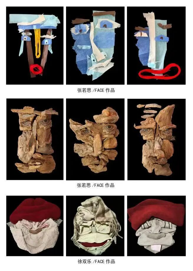 在综合材料的重构设计中,学生们以“形色的脸、有趣的物”为主题,利用日常或废弃材料的物理特性,能够按需挑选并通过多组系列作品来展示。从单件作品的精雕细琢到系列作品的全局把握,学生们平衡了主题表达的趣味性与作品的一致性,增强了审美判断力和对材料的驾驭能力。