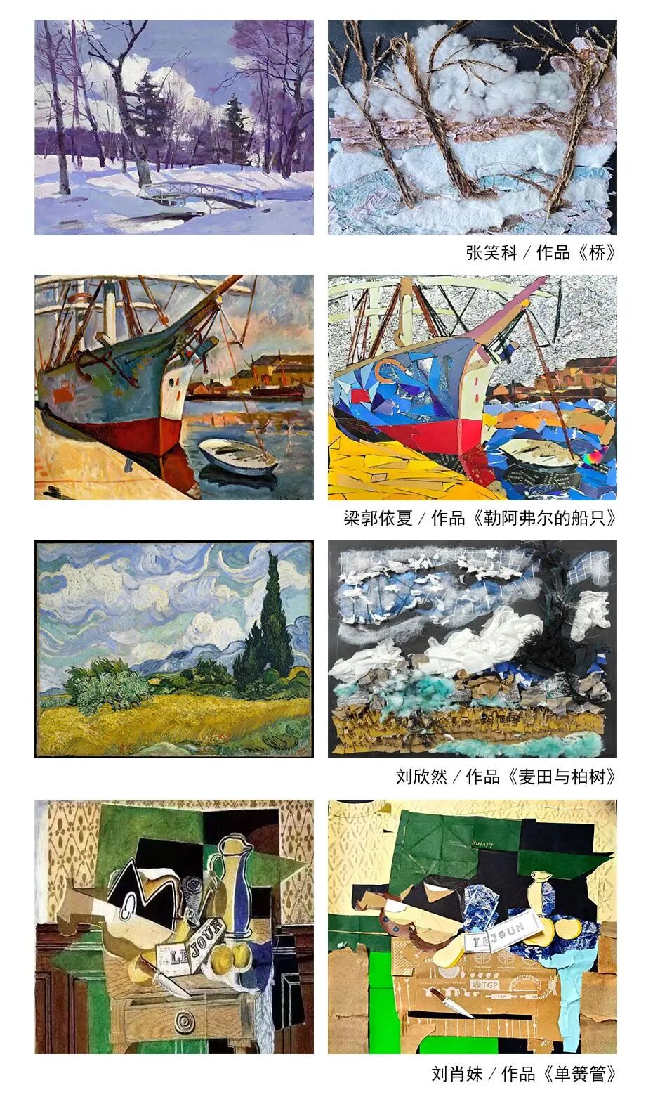 此外,经典艺术作品的材质再创作为课程增添了独特亮点。学生们以中外名画为灵感来源,突破原作的呈现方式,运用综合材料进行重塑与解读——或以彩纸、绳线拼贴,或以黏土与铁丝再现,或以废旧布料与颜料重组,既保持原作的艺术精髓,又借助材料转换赋予作品崭新的视觉感受,虚实间营造出新意象,完成了经典与当代的设计交融。