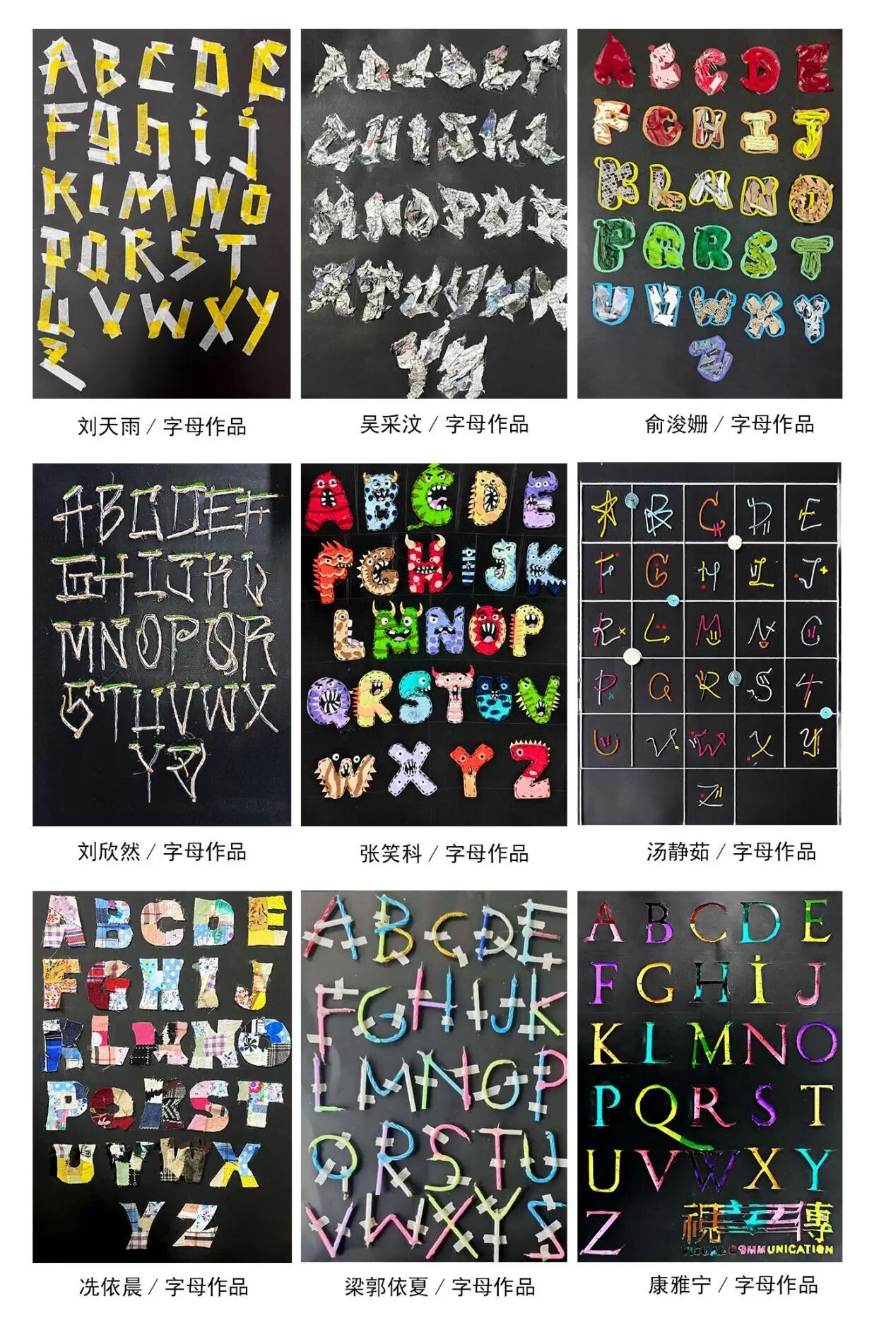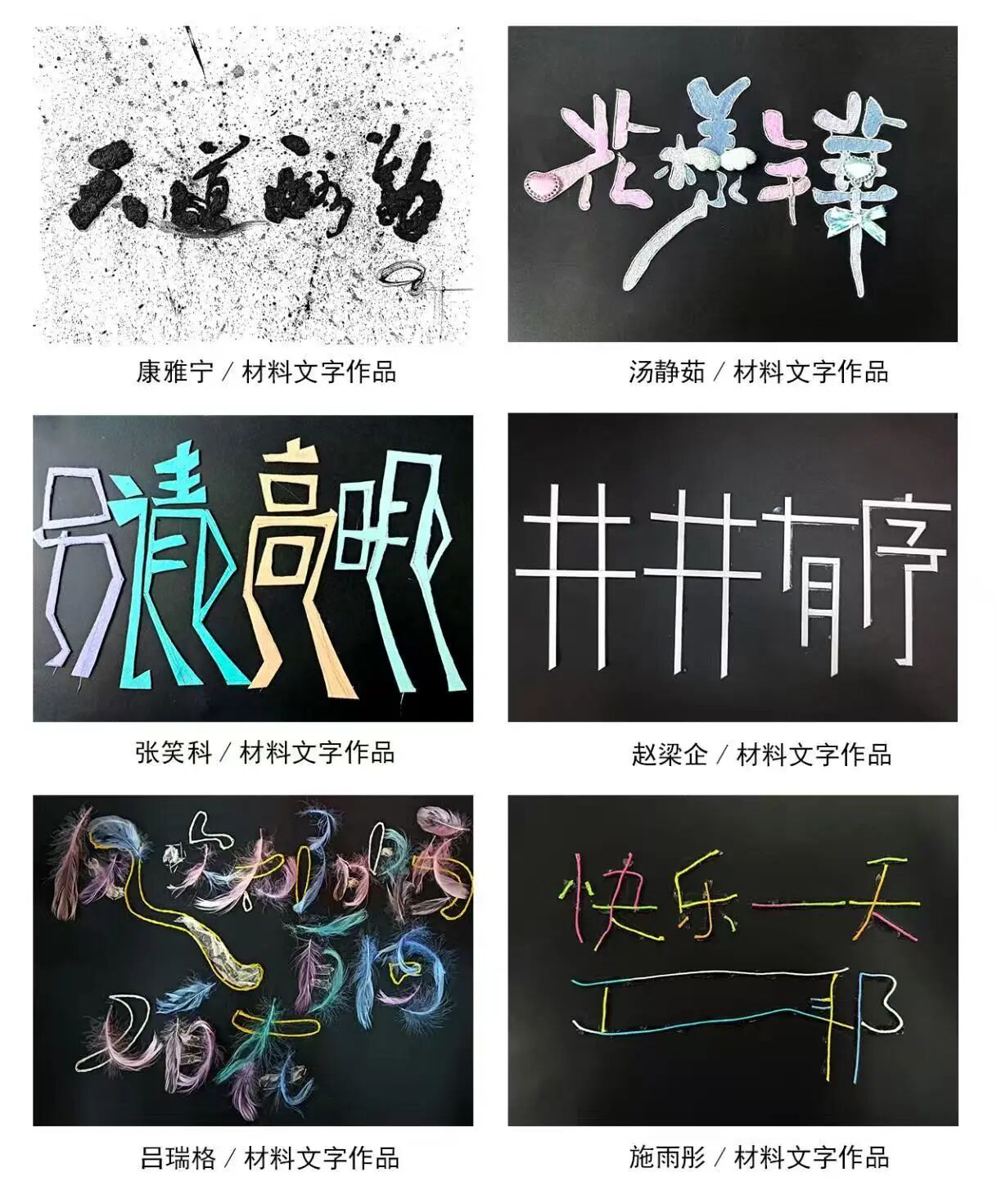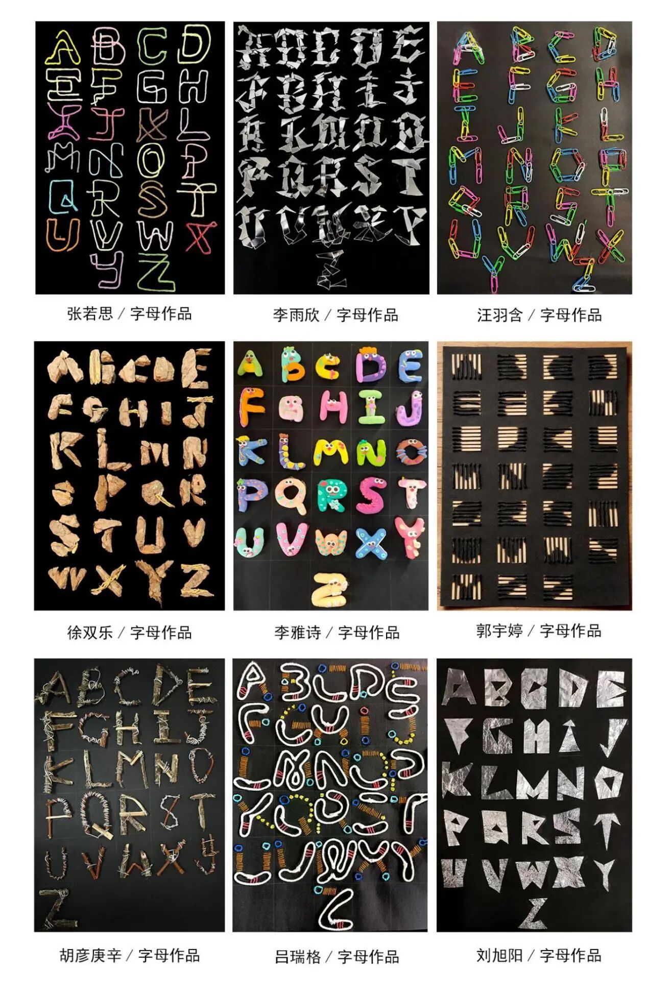 在综合材料的置换创作中,26个字母成为创意的载体。学生们突破思维局限,凭借不同材质的特性赋予字母崭新面貌,通过材质与字形的精妙组配,实现了别具一格的创意呈现,有效培养了学生们"以材赋形"的设计能力。