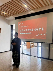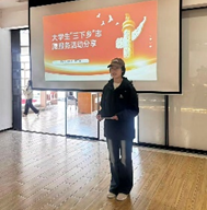随后进入核心的实践经验分享环节。两组同学结合暑期“三下乡”实践经历,依次上台交流感悟。第一组夏雨欣、韩烁菲同学,用生动的细节讲述下乡途中的收获与触动,从基层见闻中解读奉献的意义,分享了志愿服务与专业结合的独特思考。
