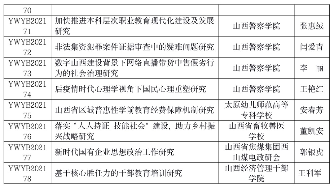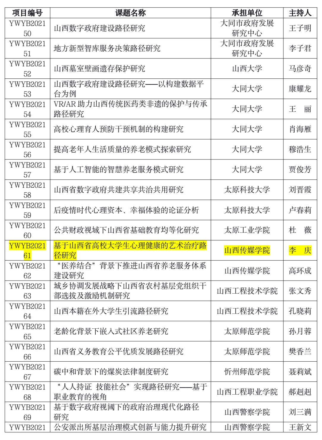 2021年6月21日,根据山西省社会科学院发布的《山西省社会科学院(省政府发展研究中心)关于2021年度规划课题立项的通知》(晋社科字(2021)22号)文件精神,由我院教师李庆申报的《基于山西省高校大学生心理健康的艺术治疗路径研究》项目,获批山西省社会科学院(山西省人民政府发展研究中心)2021年度一般课题立项,课题编号YWYB202161。