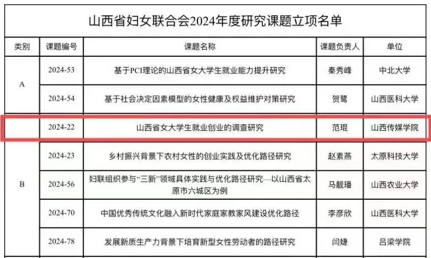 根据省妇联2024年度研究工作计划,省妇联2024年度研究课题立项名单已出。我院教师范琨《山西省女大学生就业创业的调查研究》成功入选山西省妇联2024年度研究课题。
