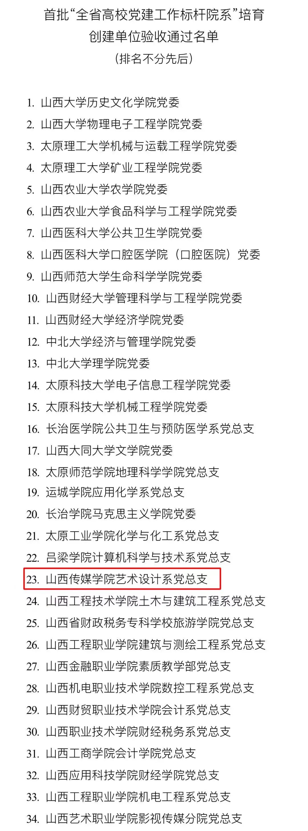 5月19日,山西省委教育工委公布首批全省高校党建工作标杆院系、样板支部、“双带头人”教师党支部书记工作室培育创建单位验收通过名单。
