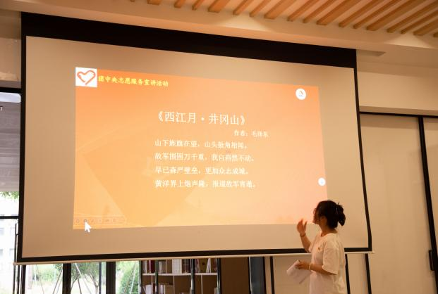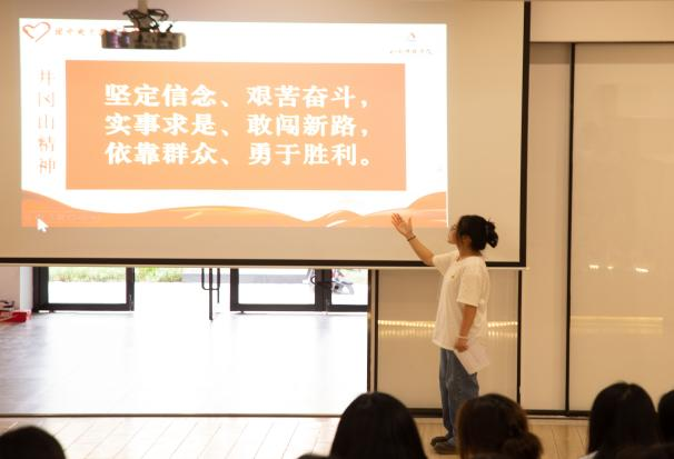 宣讲团成员王世敏同学站在台前,声音充满力量与激情,将井冈山精神的丰富内涵和历史意义娓娓道来。这种精神力量跨越了时间的界限,井冈山精神从孕育、发展到成熟的过程,完整地记录了以毛泽东同志、朱德同志为代表的老一辈无产阶级革命家对国家前途、民族命运的艰辛探索和对社会理想、人生价值的深层思考,对中国革命的历史进程产生了广泛而深刻的影响。