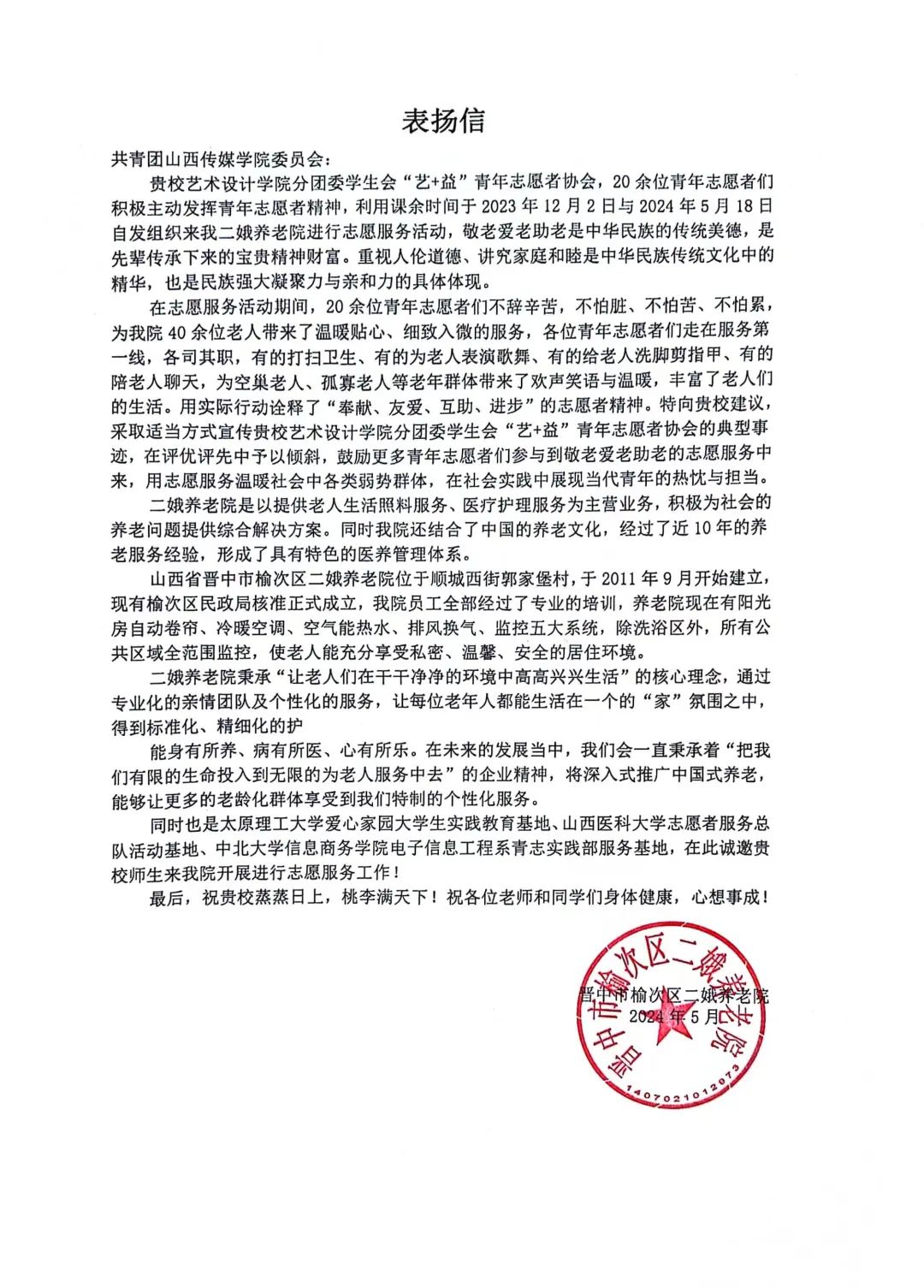 二娥养老院赠予太阳集团tyc539分团委学生会“艺+益”青年志愿者协会表扬信