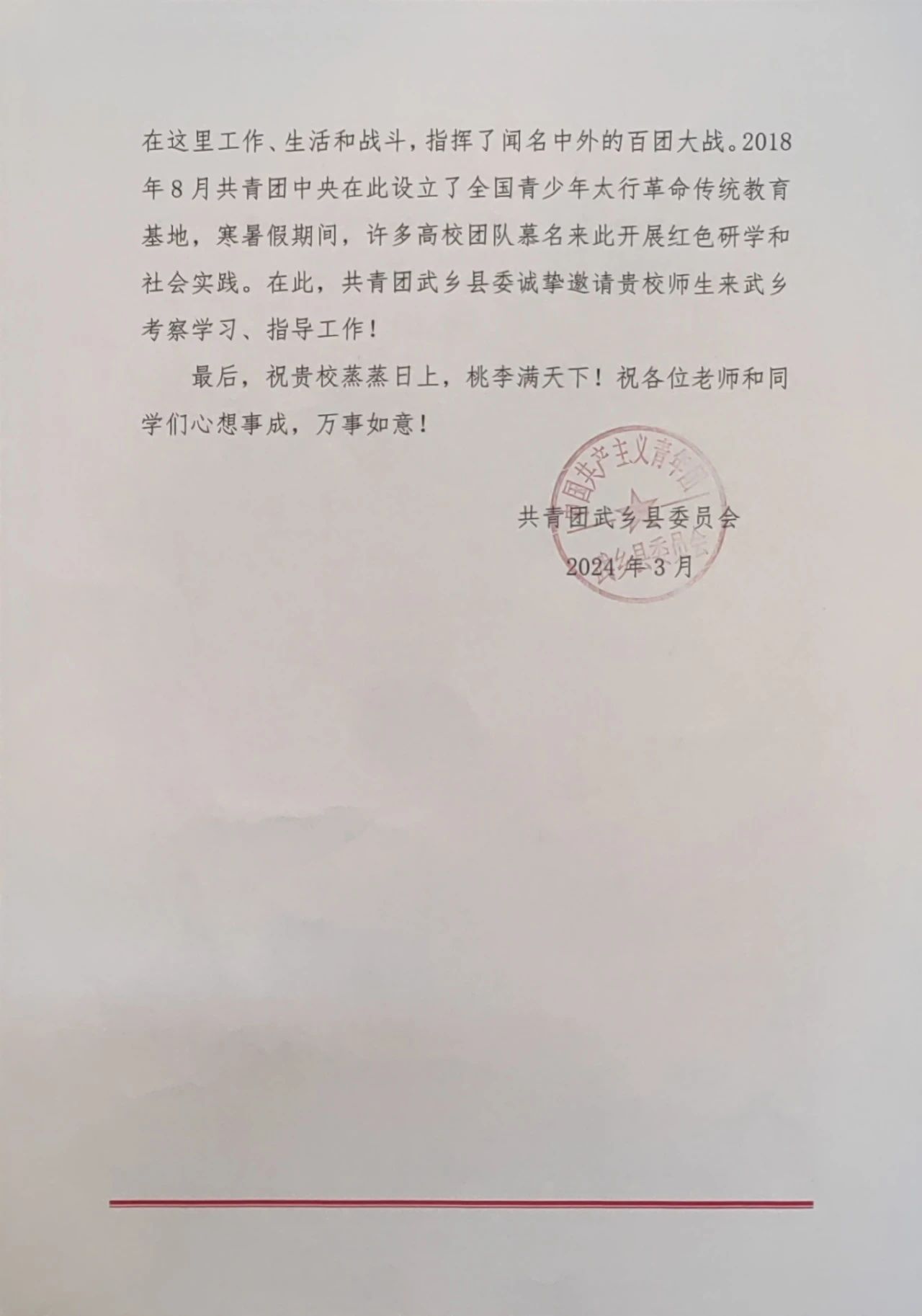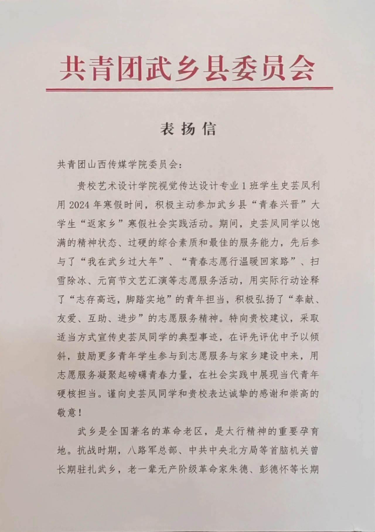 近日,我校团委收到一封由共青团武乡县委员会发来的表扬信,信中对我校太阳集团tyc5392022级视觉传达设计1班的史芸凤同学在武乡县“青春志愿行,温暖回家路”、“我在武乡过大年”等志愿服务活动的优秀表现给予充分肯定,并向我校表示诚挚的感谢。