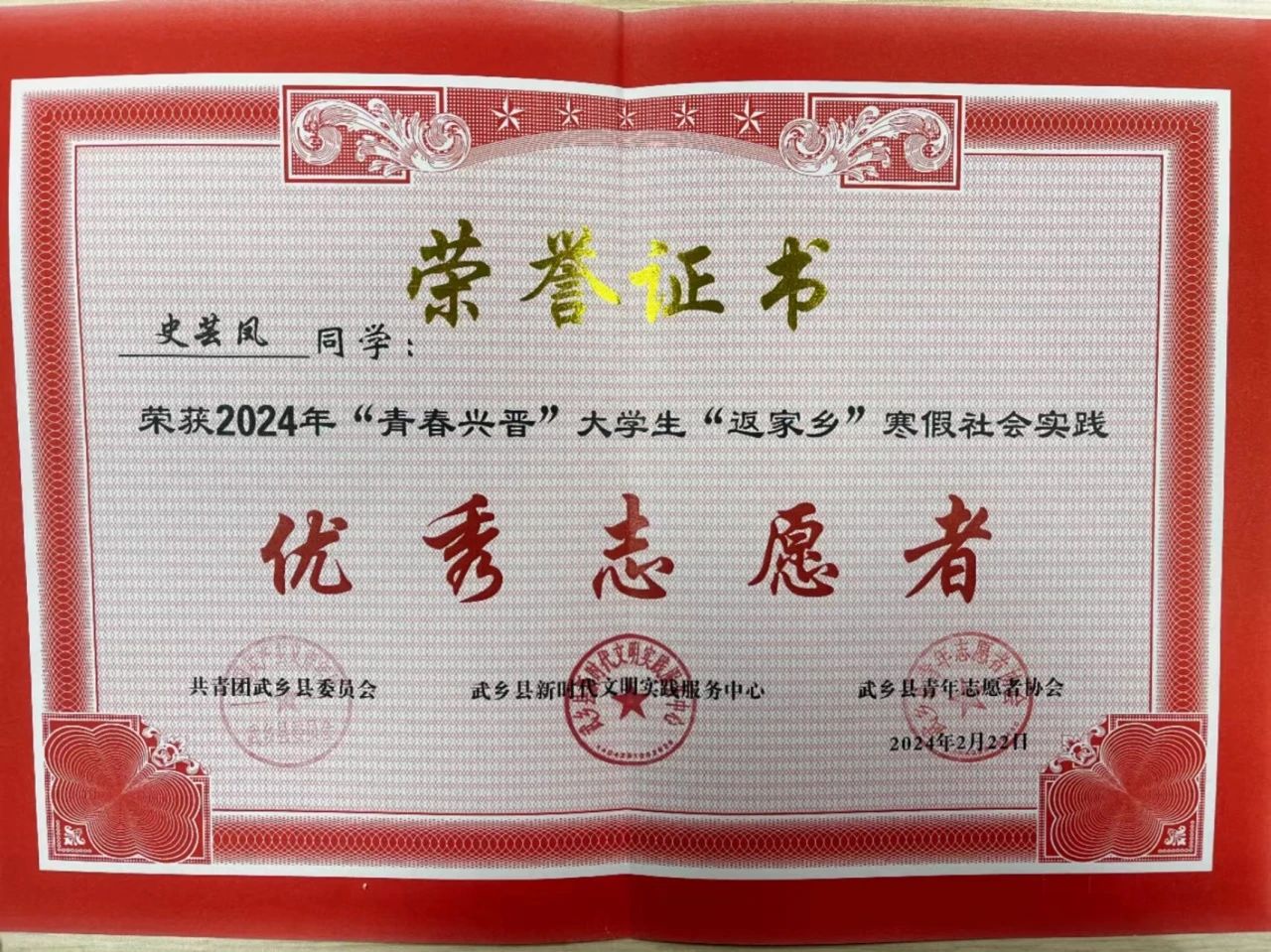 在2024年寒假期间,史芸凤同学积极配合共青团武乡县委员会圆满完成各项工作,以饱满的精神状态、过硬的综合素质和最佳的服务能力,展现了山传青年的高尚品德和精神风貌,用实际行动诠释了山传青年“志存高远,脚踏实地”的青年担当。