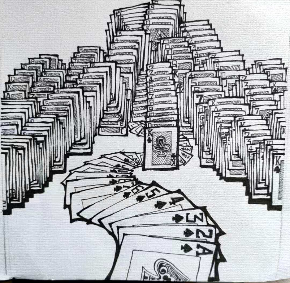 灵感来源自电脑游戏空当接龙,当游戏结束,收牌的一瞬间,重叠交织的纸牌仿佛层峦耸翠的群山,从群山中蜿蜒流淌出的是由纸牌堆砌的河流,造就了一幅新世界的山水。