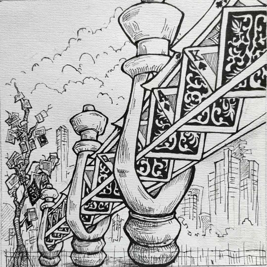 取暖的高塔被放在了最中央,人们总是把心中所想的最需要之物放在中心。而现代人最离不开的东西,信号塔则次之稍低于取暖高塔。高耸的围墙保护着城市的“心脏”。城市飞向空中,支撑柱在旁衬托。将他们最后的希望,升上天花板......