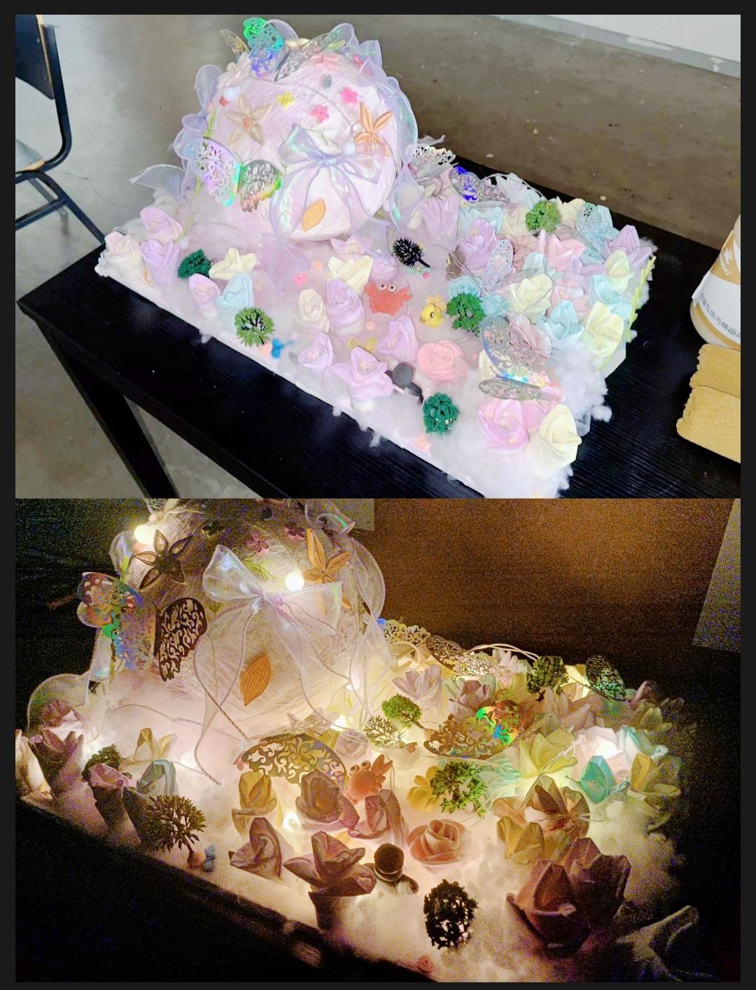 设计理念:五颜六色的花朵和蝴蝶,象征着生命的多样性和美丽。蝴蝶作为一种飞翔的昆虫,象征着自由和轻盈。棉花作为柔软的材料,给人一种温暖和舒适的感觉。炫丽的巨大球体代表梦幻。蝴蝶表达了追求自由和快乐的心态,彩花和绿树代表世界的活力,搭配暖色灯光和棉花,创造一个柔和而温馨的氛围。