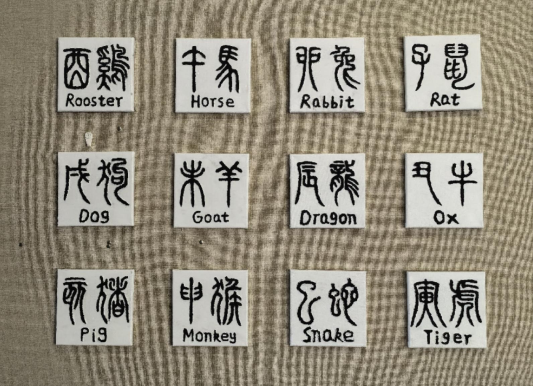 设计主题:利用丙烯、石英砂的特殊质感和丰富色彩,为传统的篆书字体赋予了新的视觉效果。篆书是中国古老的字体之一,而十二生肖则是中国传统文化的重要组成部分,在设计中加入每个生肖对应的英文翻译,体现了中西方文化的交流与融合。