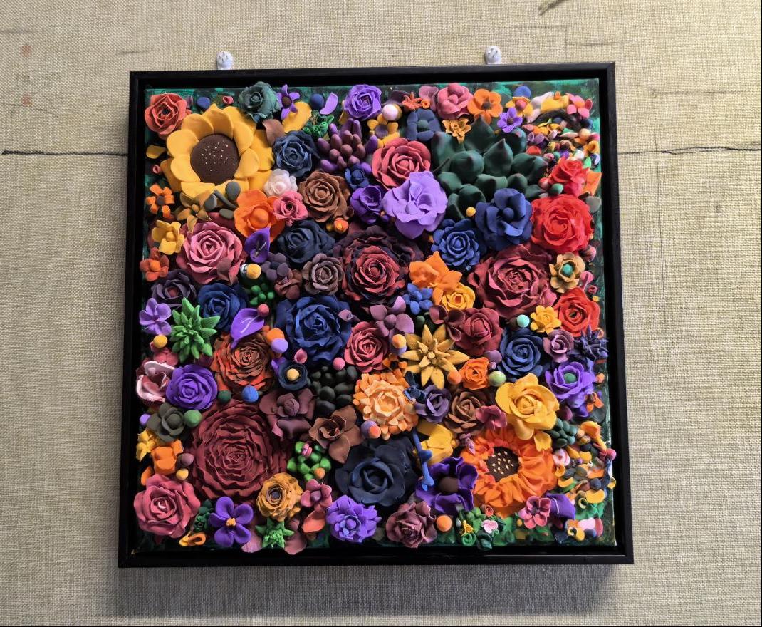 设计理念:蝴蝶翅膀和郁金香结合,传达强烈的美和自由。材质的巧妙运用,增加作品的纹理和触感,粘土材料表现郁金香的质感和层次感,保持作品的稳定性,石英砂增加作品的肌理性。