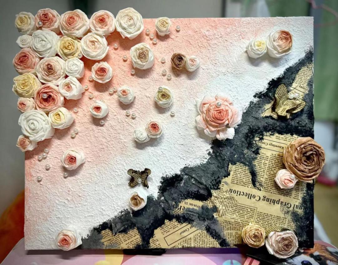 设计理念:将渐变粉色石英砂肌理画以及纸叠玫瑰花作为主视觉元素,给人一种柔和而温暖的感觉,传递出一种温馨和浪漫的情感,黑色裂痕则象征着生活中的伤痛和不完美之处,珍珠则象征着纯洁和美丽,而怀旧英文报纸则为整个作品增添了一份艺术气息和历史感。通过展现不同材质和元素的对比和融合,展现了柔美和浪漫的一面,又传达了对生活中伤痛和不完美的思考和反思。