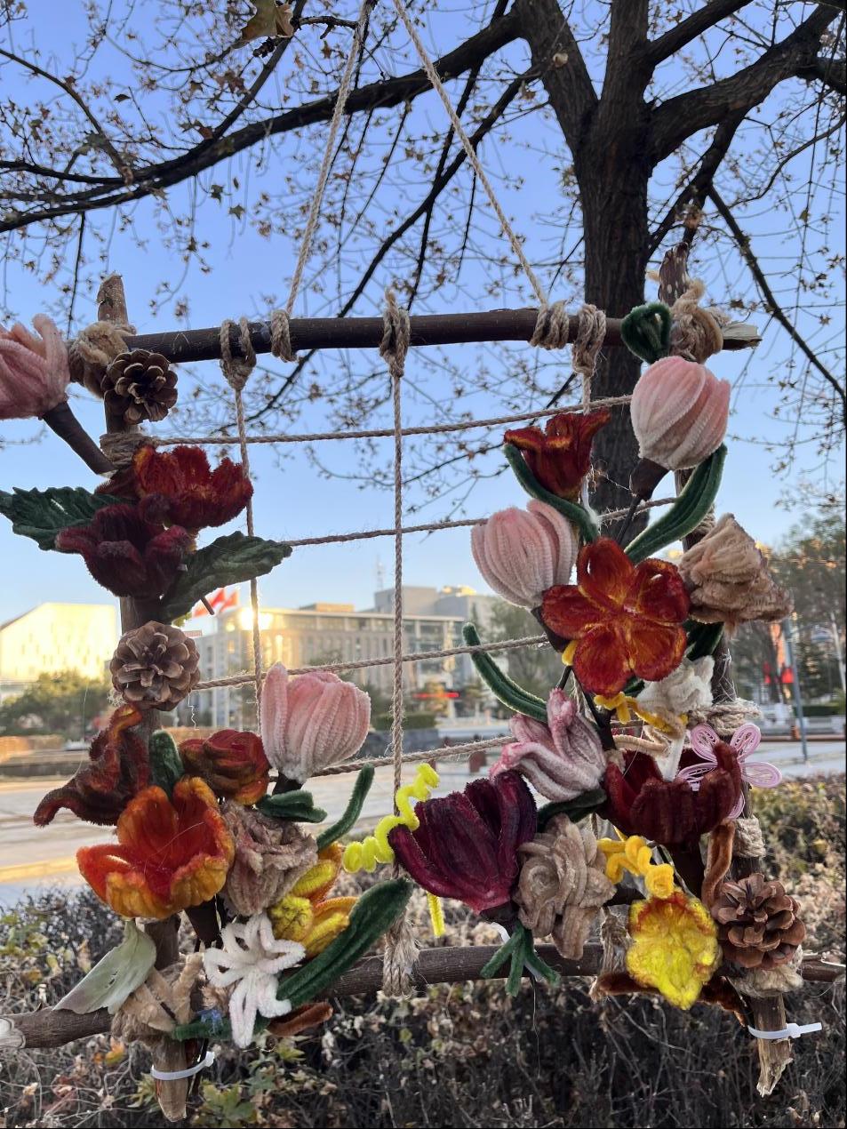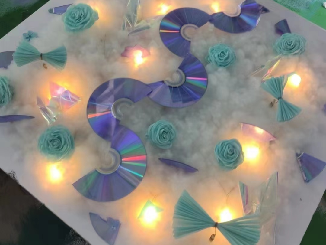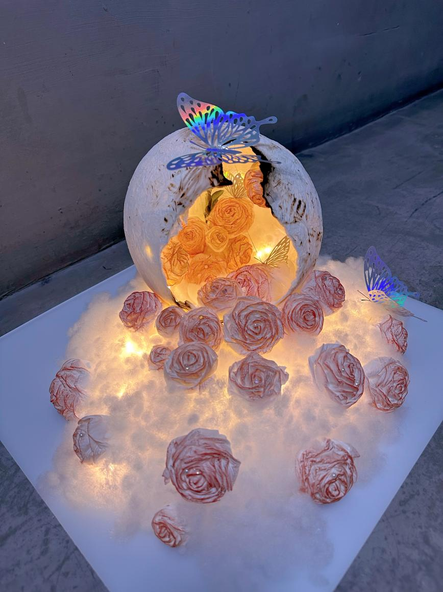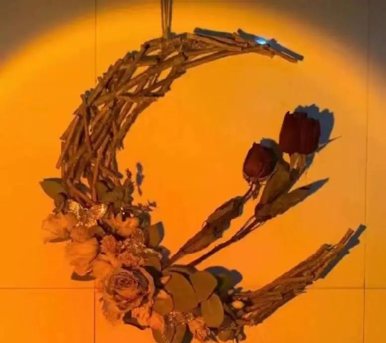 设计理念:废弃的树枝以及掉落下来的叶子,花朵等组合在一起,实现废品再利用,月亮是花海中最娇艳的花朵,它的光芒如同花瓣一般绽放,让人感受到无尽的美好。月影映花开,美不胜收。