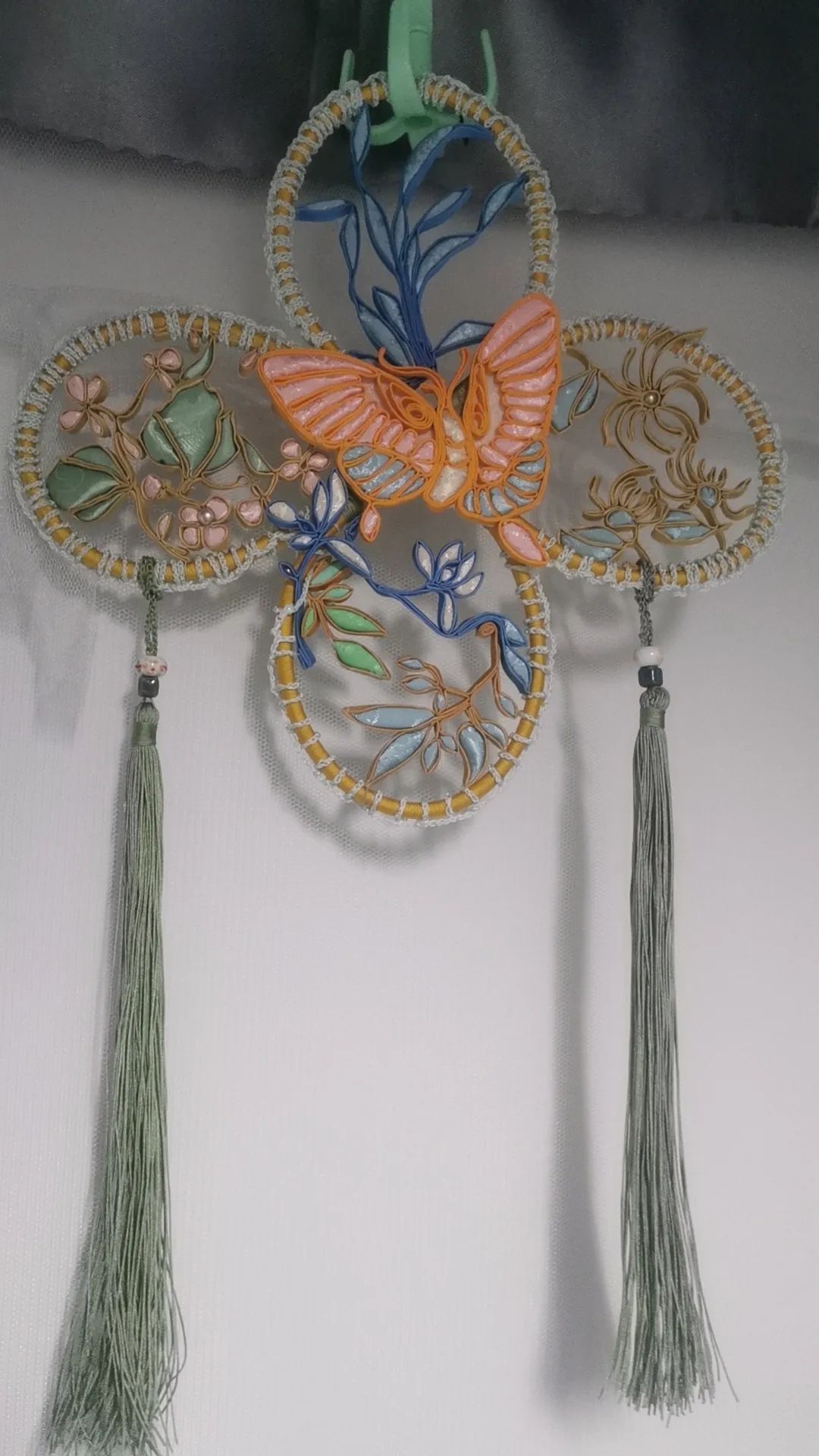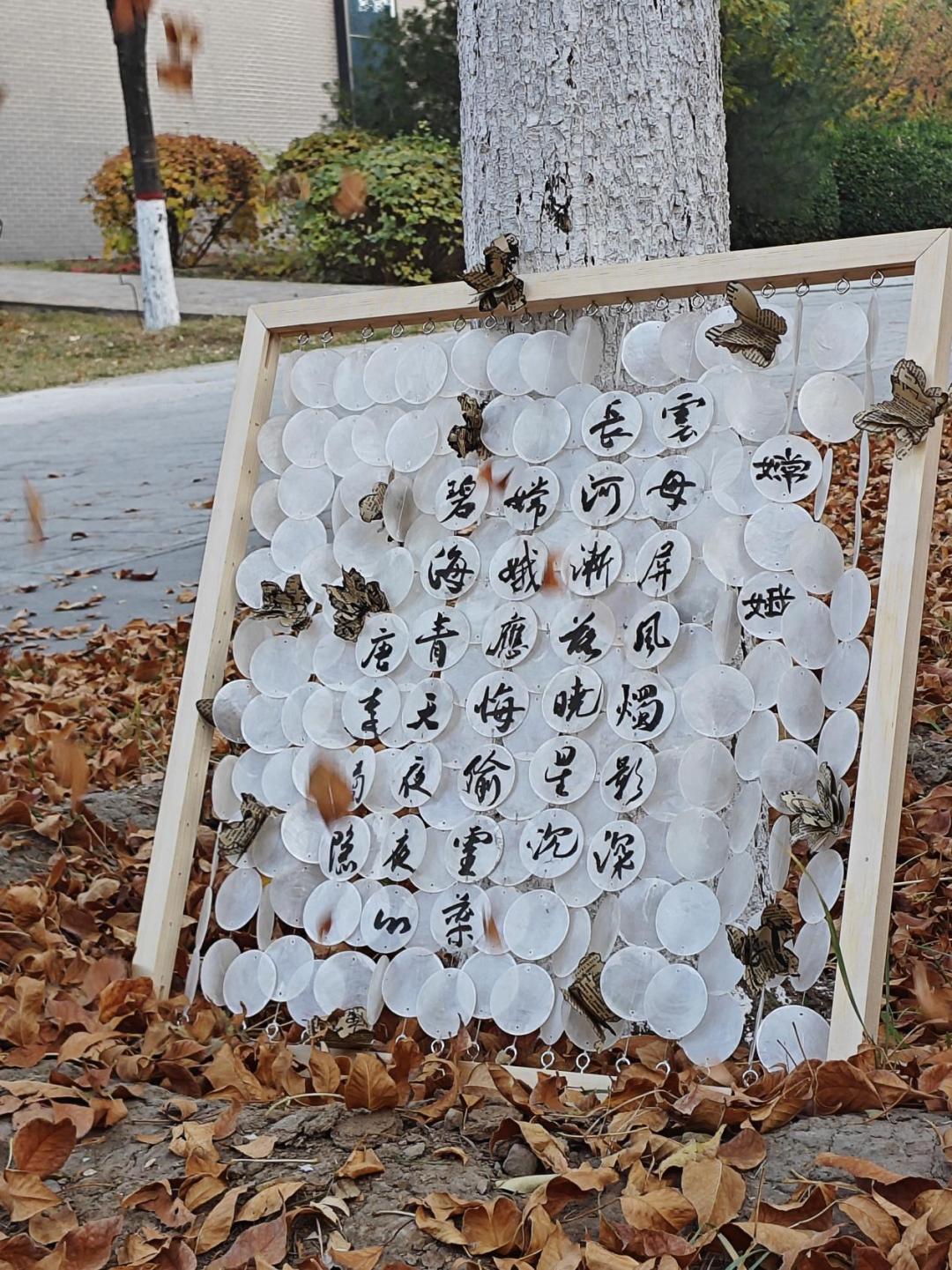 设计理念:微风拂过,贝壳相互碰撞发出悦耳铃声,让人心旷神怡。云母贝壳与书法、纸烧蝴蝶的结合,自然、文化和美的完美交融,书法为墨,赋诗嫦娥一首,纸烧蝴蝶为翅,自然与艺术融合,让美丽在指间绽放。