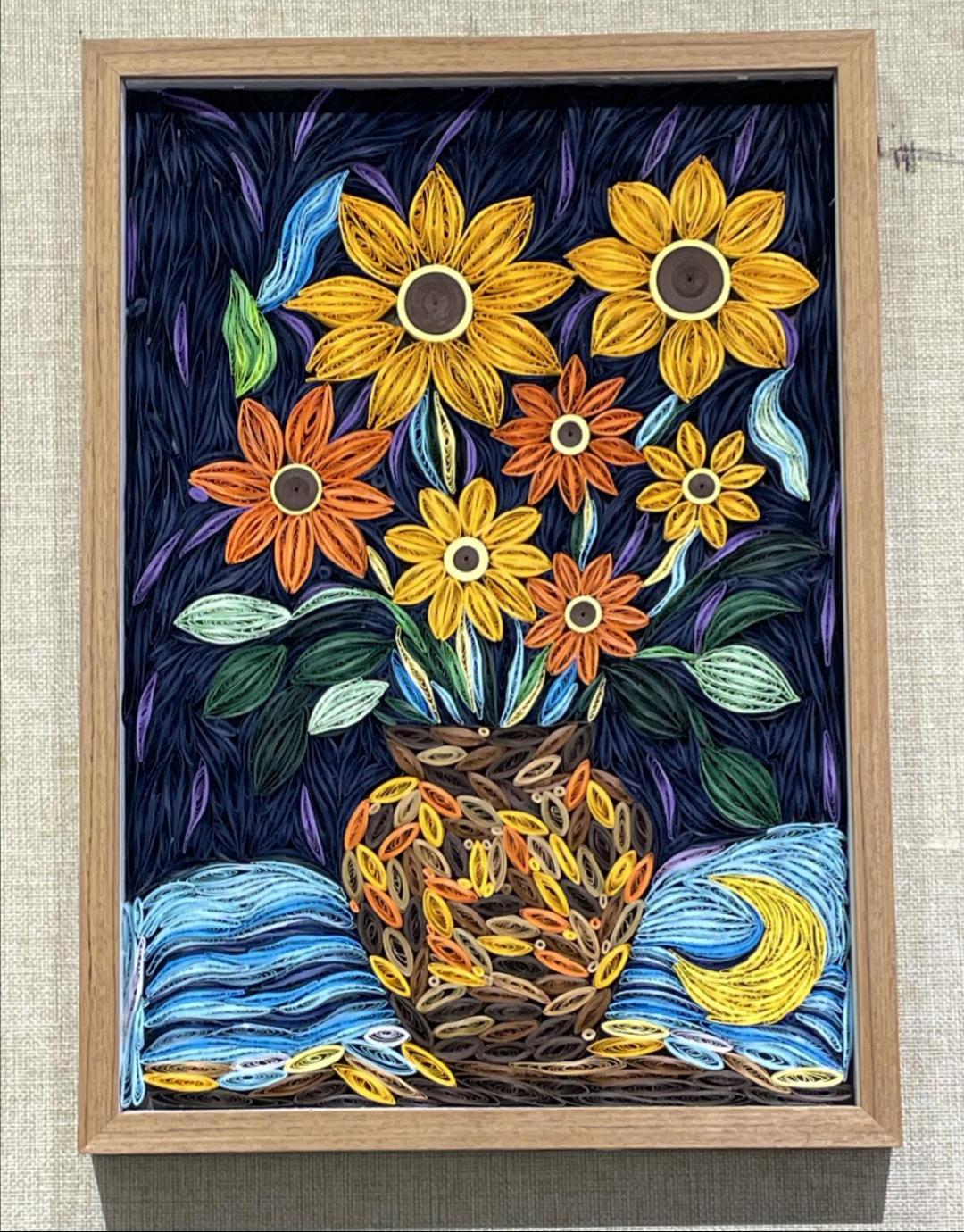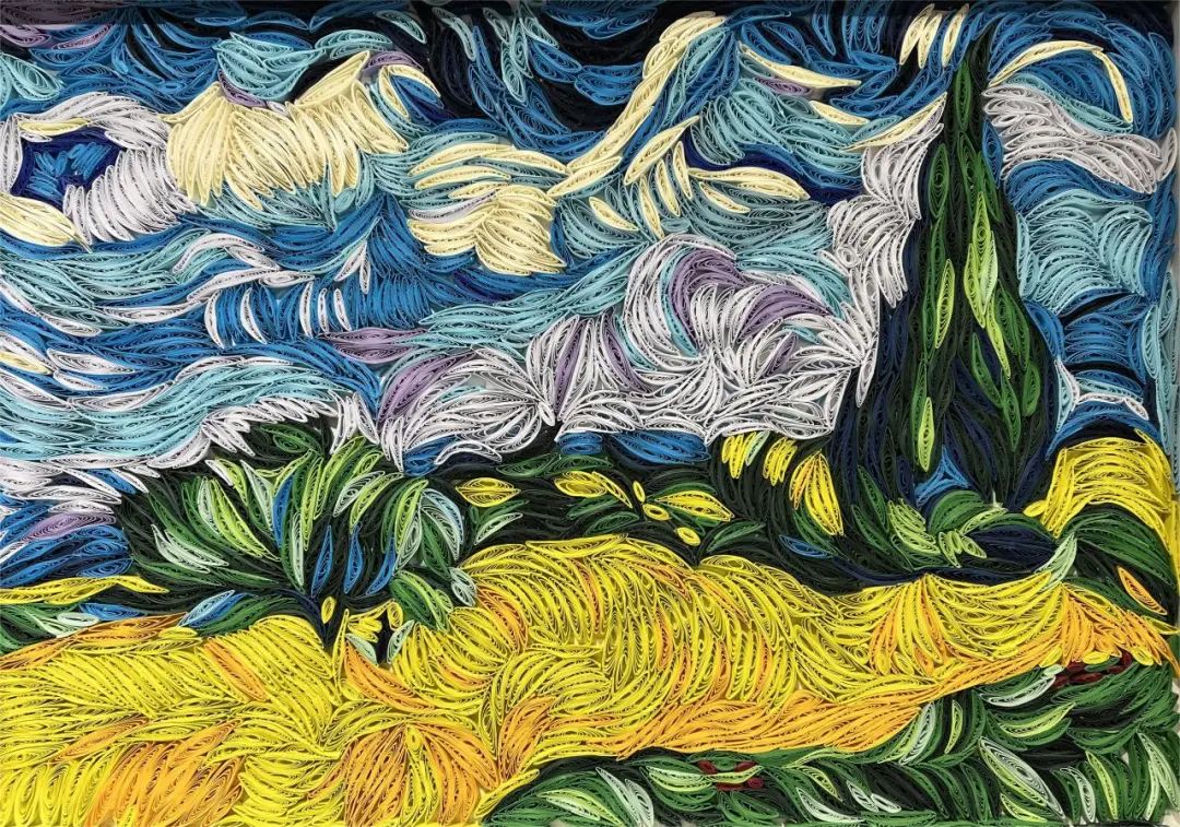设计理念:采用衍纸构成的工艺,生动地表现出对自然美的独特描绘,以及人类与自然的关系的思考。柏树被认为是象征着人类的坚韧和生命力,而金黄色的麦田则代表着丰收和丰盈,展示了对大自然的敬畏和热爱。