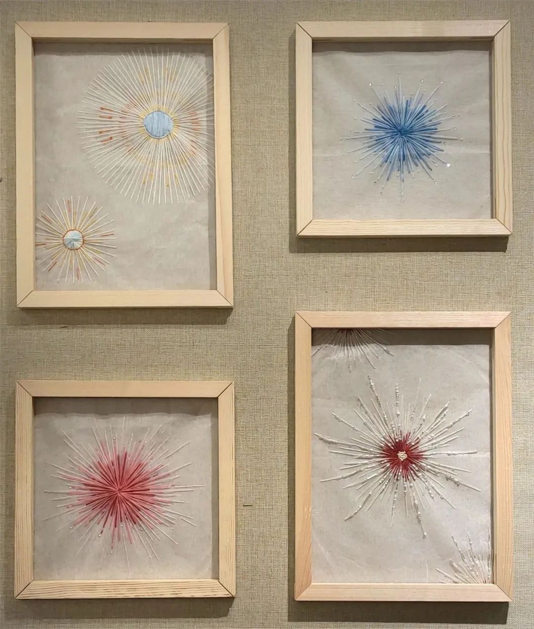 设计理念:刺绣是一种具有悠久历史和深厚文化底蕴的传统手工艺,因此在设计刺绣作品时,要尊重和传承刺绣的传统工艺和美学理念,同时也要注重创新,将烟花和珠绣元素融入到设计中,以适应现代人的审美需求。半透明无纺布嵌入不同的颜色和珠子,运用不同的颜色表现出不同的圆形图案,表现刺绣的艺术性与现代化的结合。