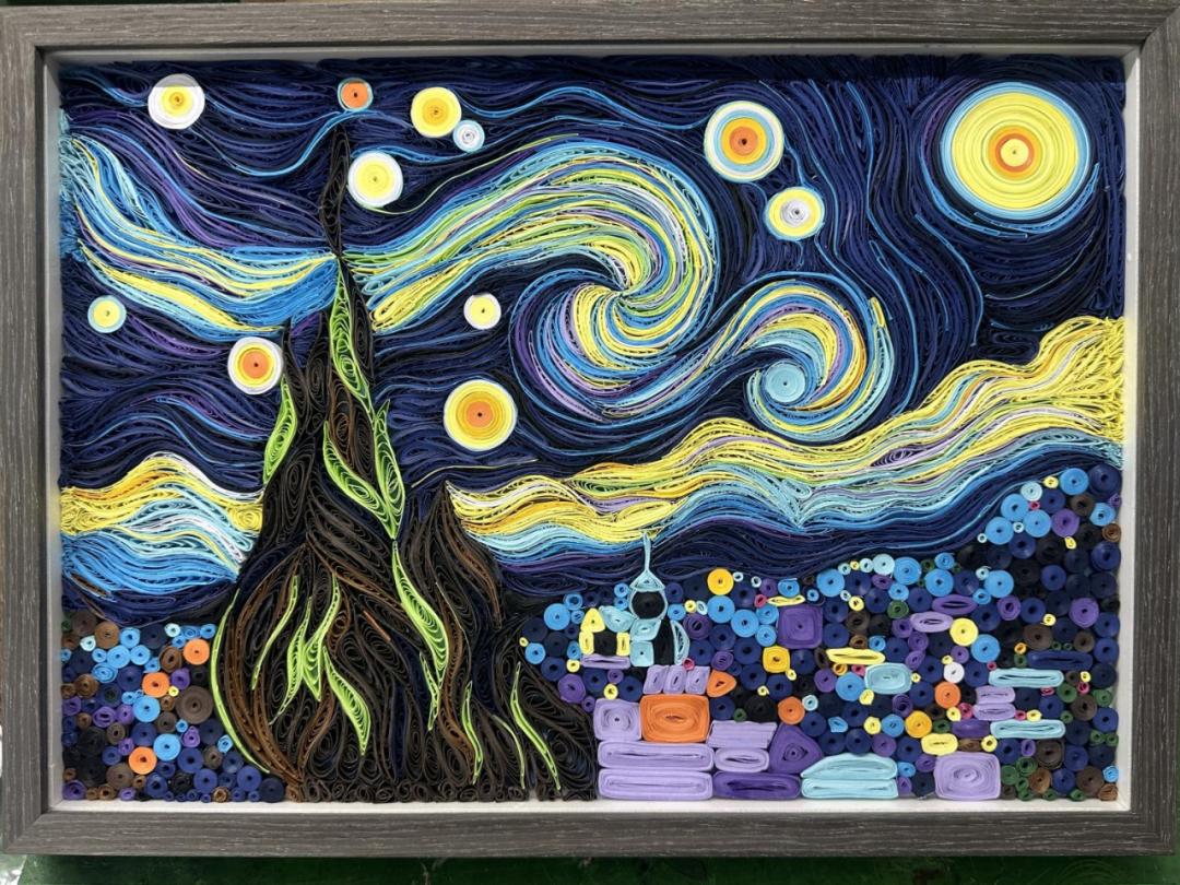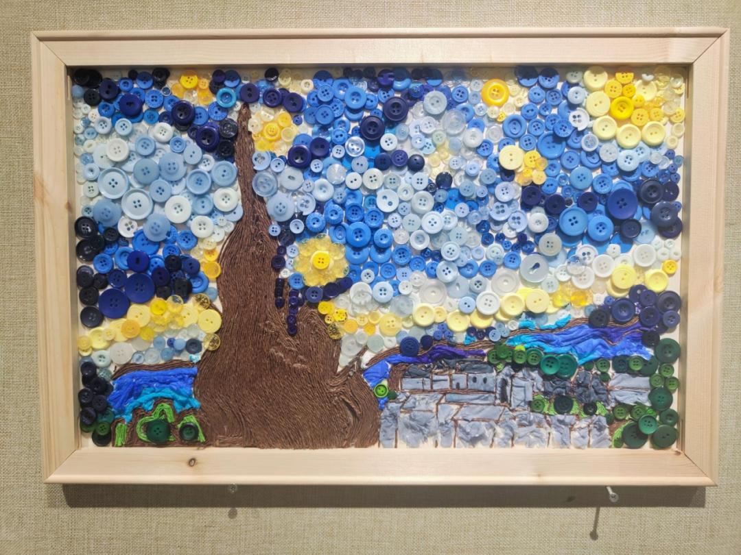 设计理念:该作品灵感来源于梵高的《星月夜》,用纽扣、纸绳以及碎纸沫结合而成,表达了时间的流逝。