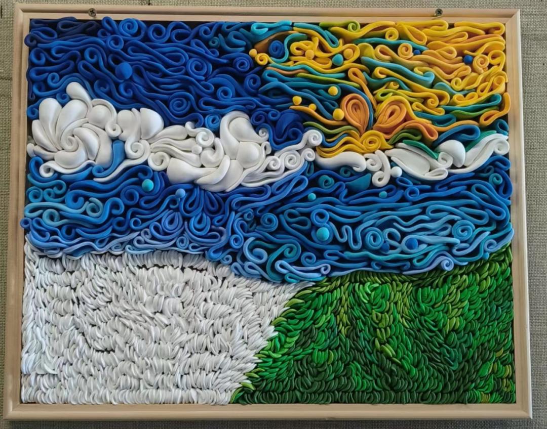 设计理念:使用超轻粘土,通过捏出不同的造型图案和曲线并进行排列组合,将太阳、草地、天空表现出来。天空象征着广阔和自由,草地和太阳代表着生机和希望,这一画面营造的舒适恬静的氛围是内心所向往的地方,是内心对自由的向往。