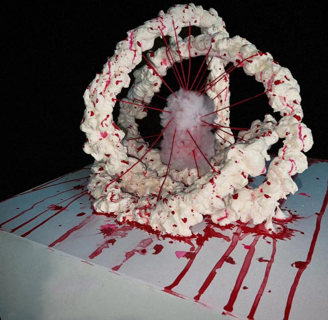 设计理念:在这个充满着压力的世界里,每个人都在勇敢地追寻属于自己的激情与乐土。然而,有时候来自四面八方的束缚也让人们难以喘气。将这种束缚刺破、瓦解,绯红的血色浸染过的痕迹也让我们找到了真正的自我。愿你我在这个束缚的时空中找到刺破束缚的那一抹绯红。
