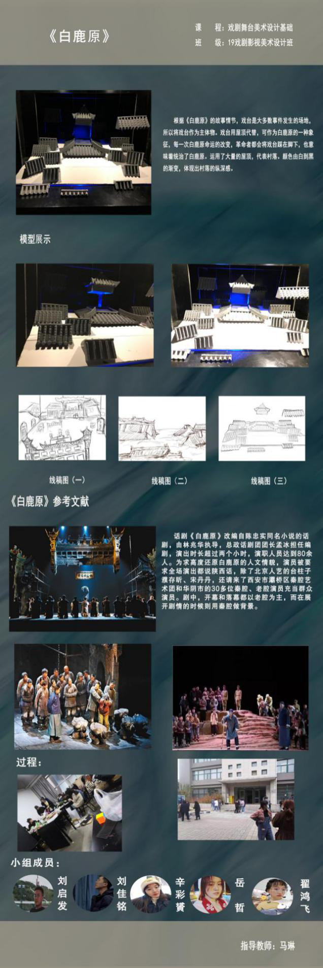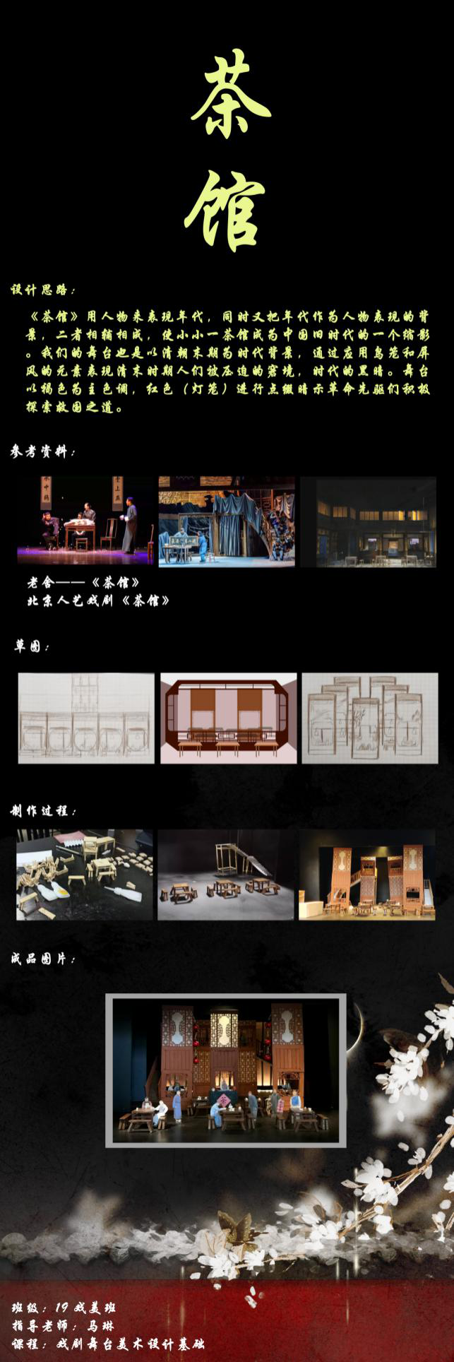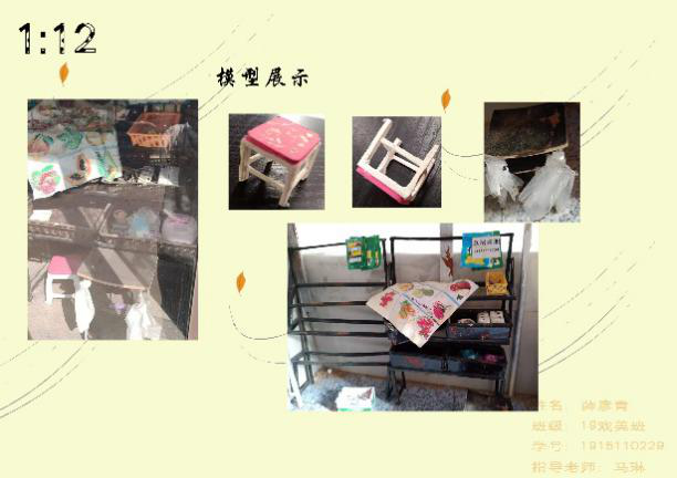 戏剧舞台美术设计基础课程是一项综合性的课程,在学习与制作中从解读剧本,查询资料再到后期的设计与制作都会有意想不到的惊喜,材料的选择与肌理的构成都会影响到后期的成果,在这期间不仅仅需要多方面的思维创新能力和长时间耐心的雕琢,更多的是需要推倒重来的勇气。通过这门课程我们不但学到了材料的综合运用与观察生活的细节,而且增进了成员之间的言语交流与思维的碰撞。于我们而言戏剧舞台美术设计是一项必不可少的基础课程。