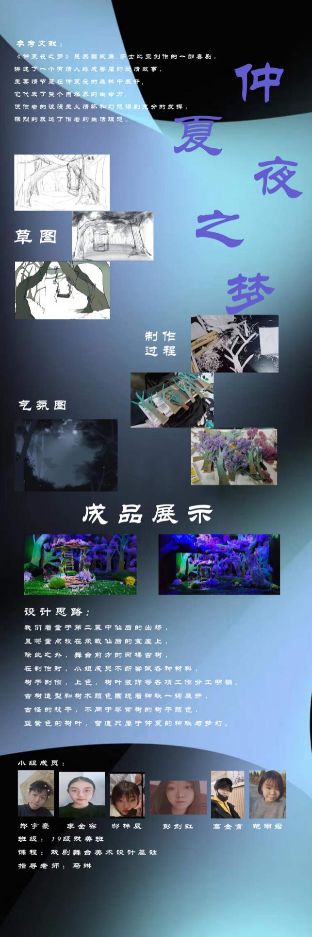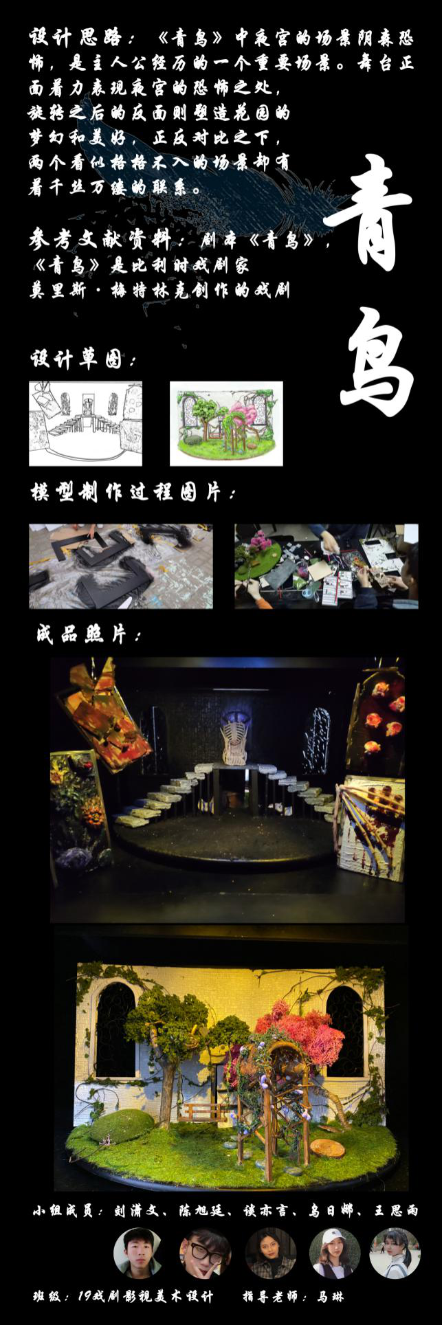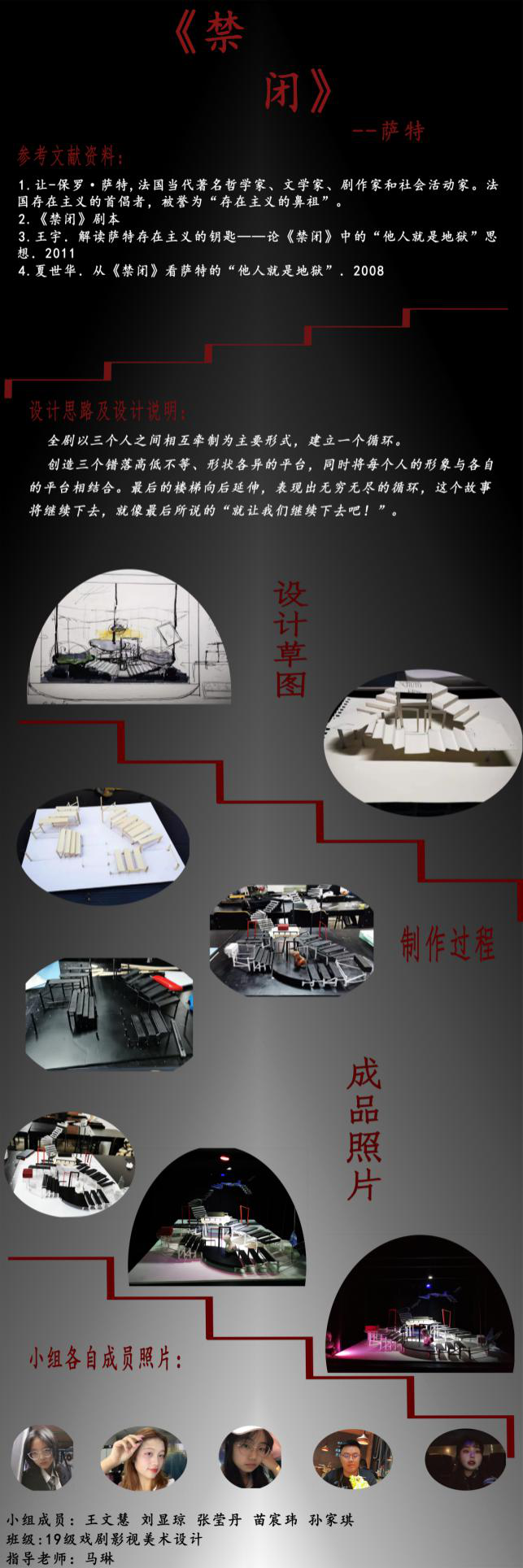 戏剧舞台美术设计基础课程是一项综合性的课程,在学习与制作中从解读剧本,查询资料再到后期的设计与制作都会有意想不到的惊喜,材料的选择与肌理的构成都会影响到后期的成果,在这期间不仅仅需要多方面的思维创新能力和长时间耐心的雕琢,更多的是需要推倒重来的勇气。通过这门课程我们不但学到了材料的综合运用与观察生活的细节,而且增进了成员之间的言语交流与思维的碰撞。于我们而言戏剧舞台美术设计是一项必不可少的基础课程。