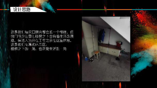 设计思路:这是我们每次回宿舍都会的一个楼梯,但是我们很少注意到楼梯之下也有着生活的痕迹,保洁人员会在工作之余在这里休息,这是他们专属的休息区。楼梯之下的一角,也正是生活的一角。