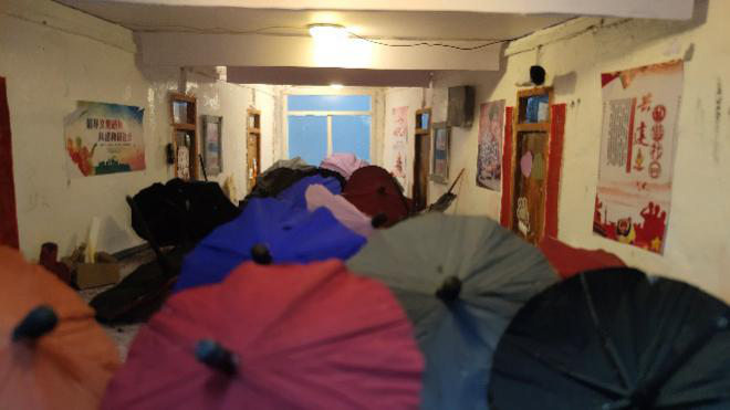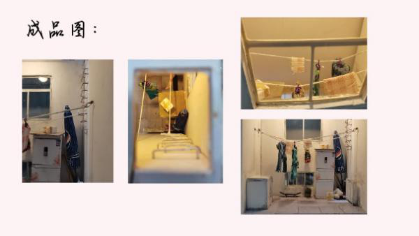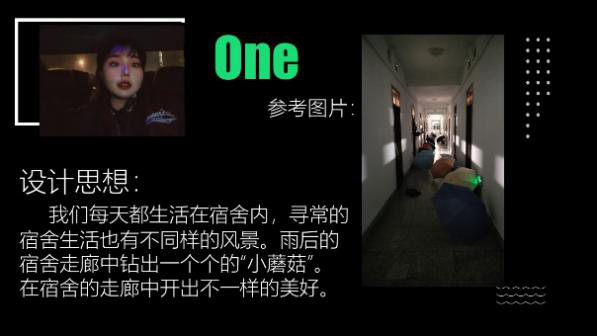 设计思想:我们每天都生活在宿舍内,寻常的宿舍生活也有不同样的风景。雨后的宿舍走廊中钻出一个个的“小蘑菇”,在宿舍的走廊中开出不一样的美好。